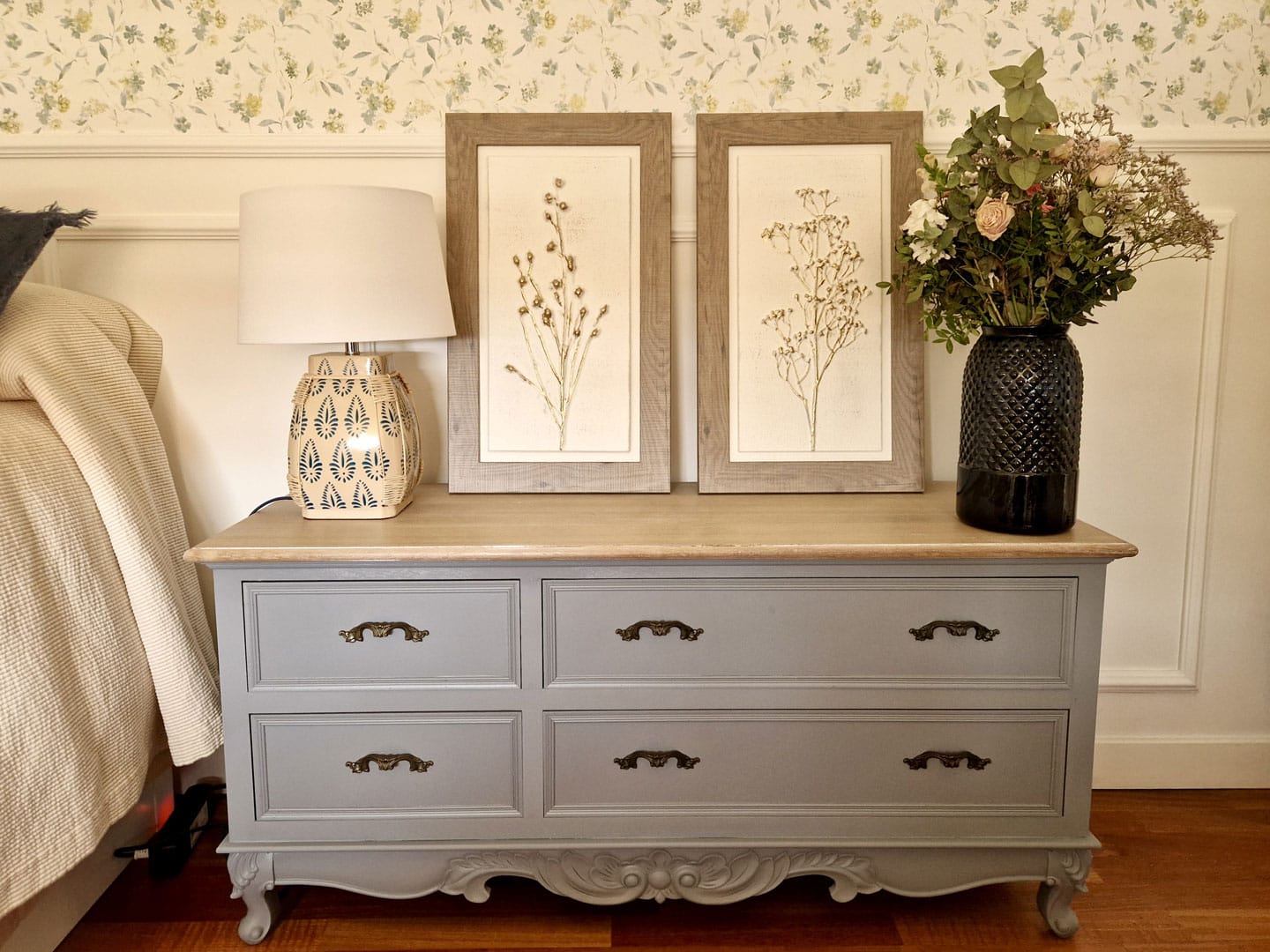 La habitación de la joven de la casa es de estilo Provenzal, cumpliendo sus deseos con friso de molduras, muebles clásicos y tonos azules y beige.