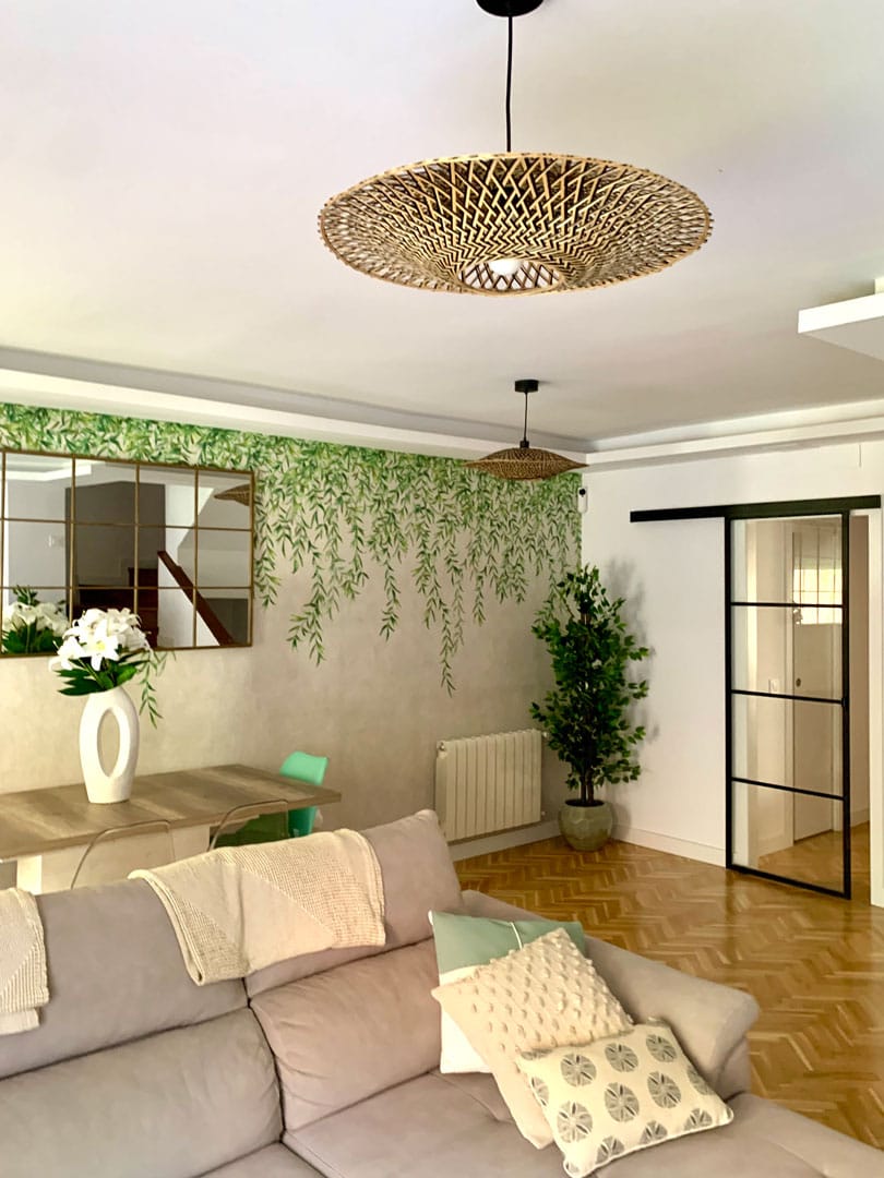 Nos decantamos por un mural, un espejo ventana, nuevas lámparas , mucha vegetación y nuevos textiles para darle otro aire más acogedor.