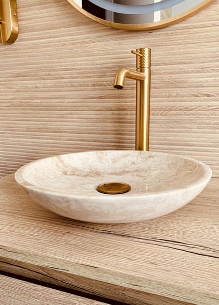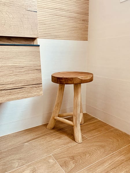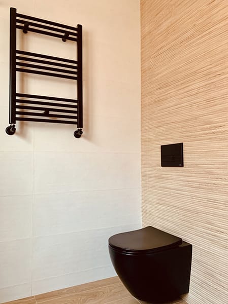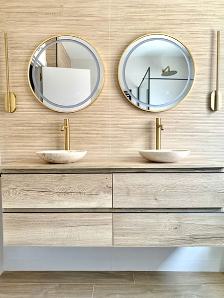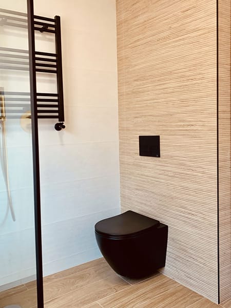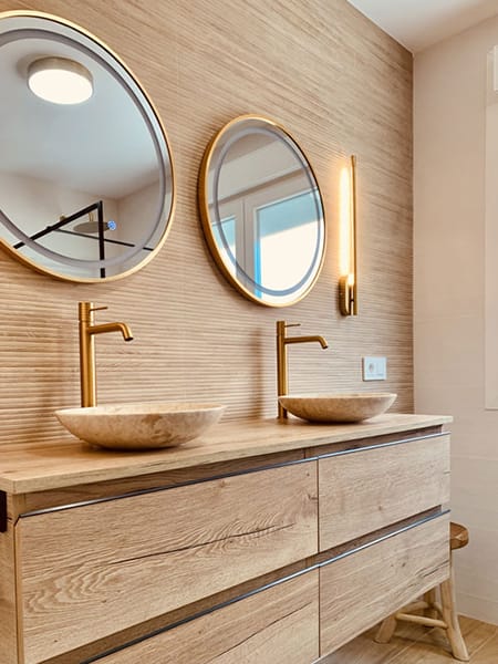 El diseño se ha basado en darle calidez con el porcelánico de madera , modernidad con el negro de los sanitarios, sofisticación y lujo con el dorado de su grifería y el mármol de sus lavabos.
