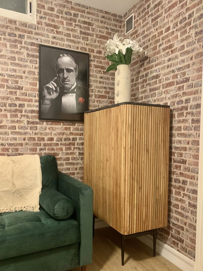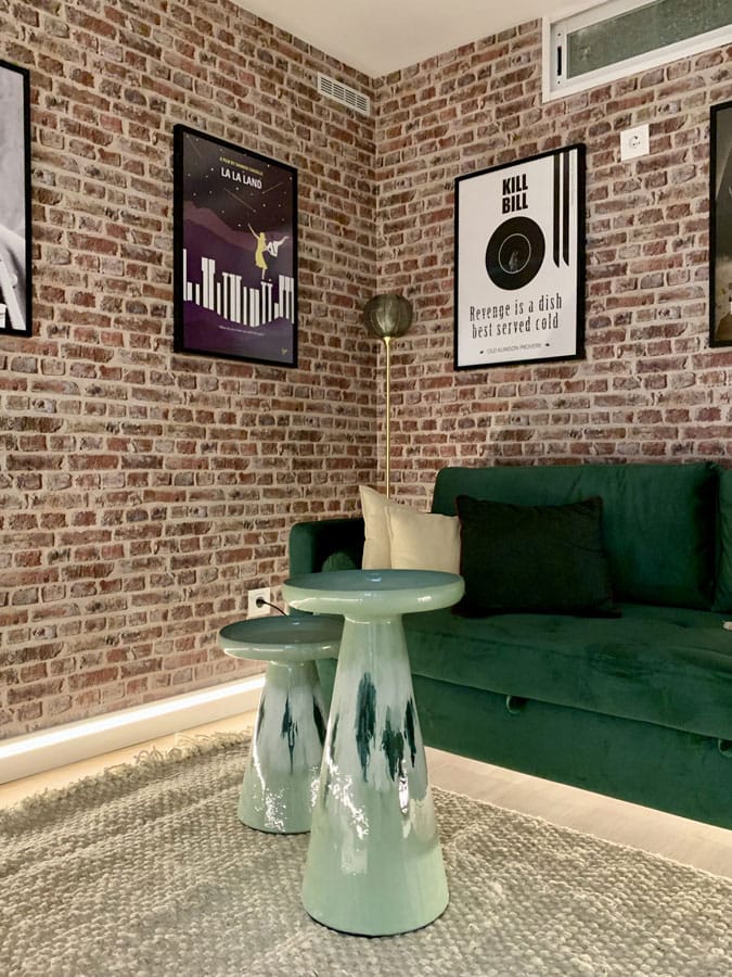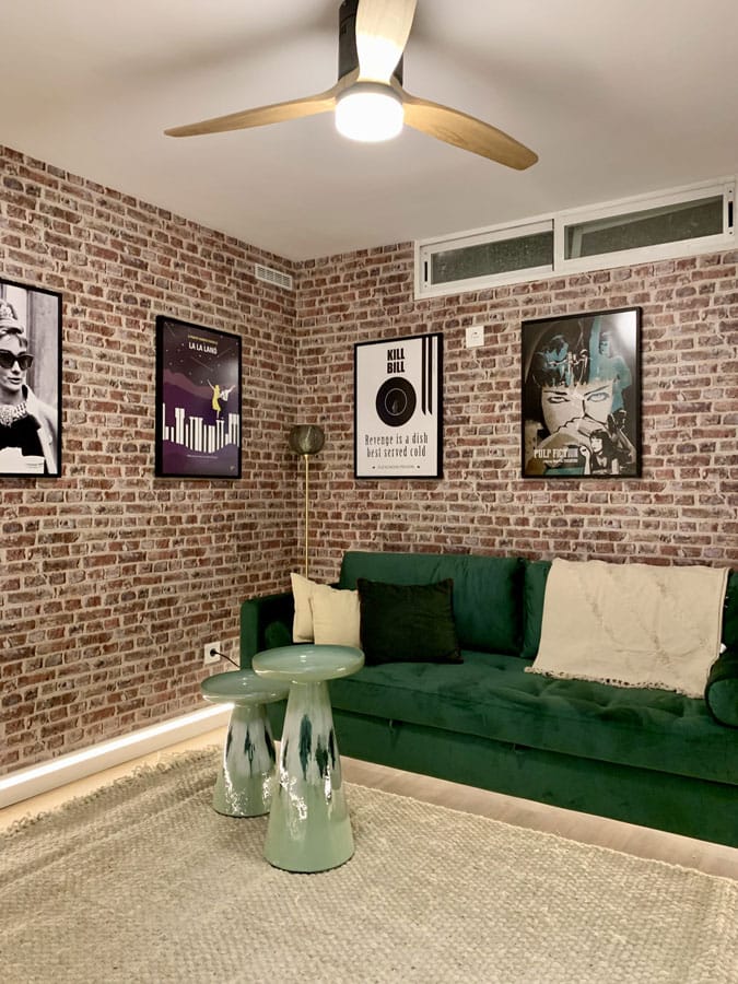 Otra de las zonas no aprovechadas era una habitación en planta sótano convertida en sala de cine de estilo industrial, con su papel pintado de ladrillo, sofá cama para la familia y los cuadros de las películas preferidas de esta familia.