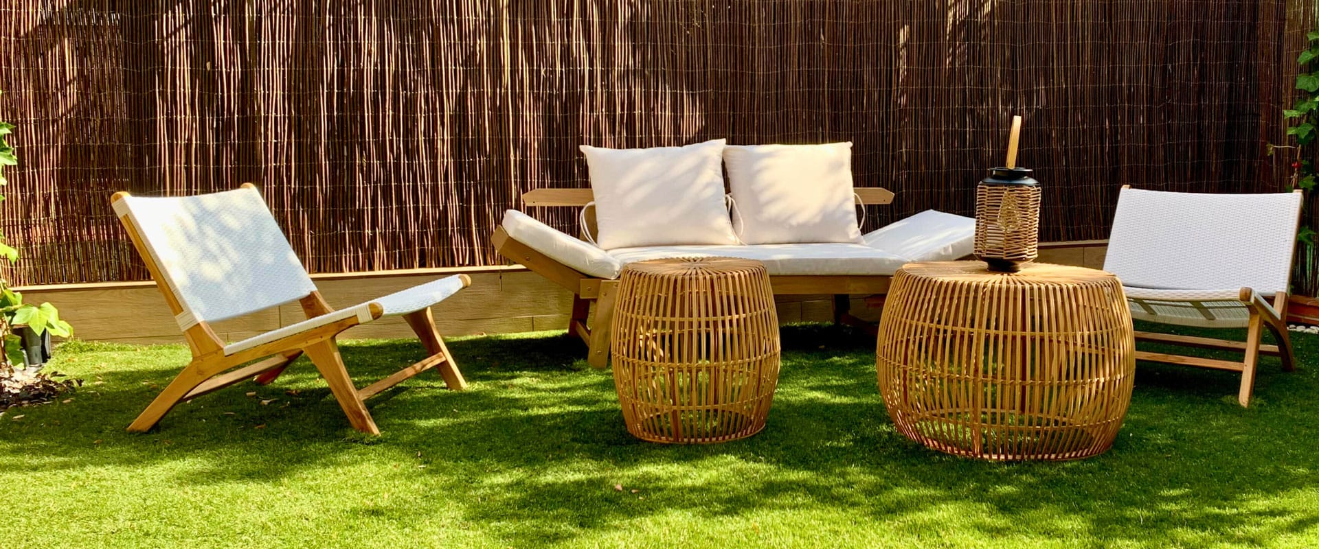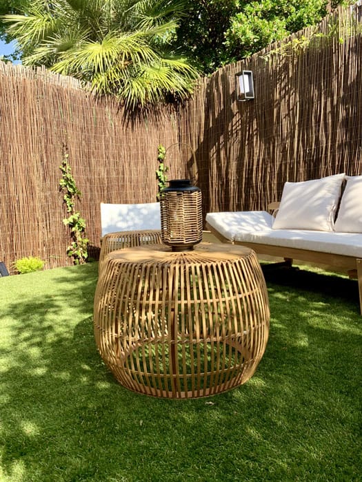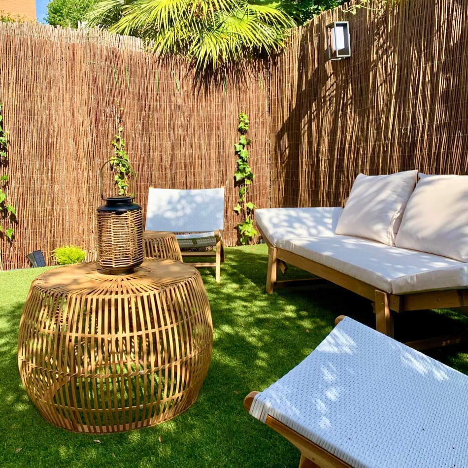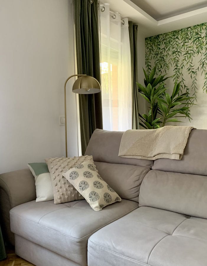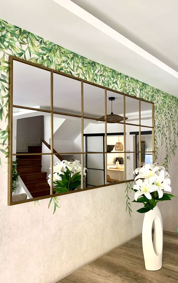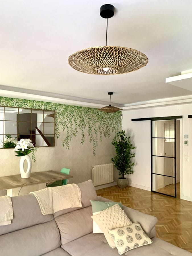 Nos decantamos por un mural, un espejo ventana, nuevas lámparas , mucha vegetación y nuevos textiles para darle otro aire más acogedor.