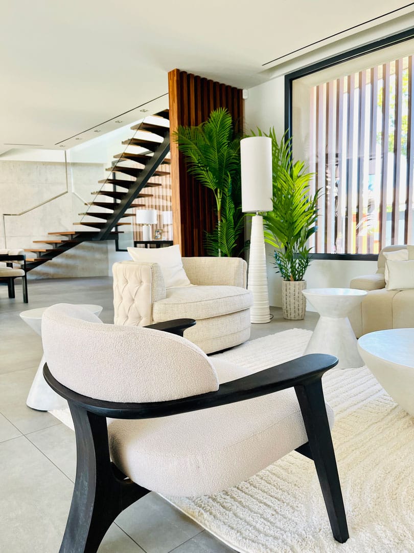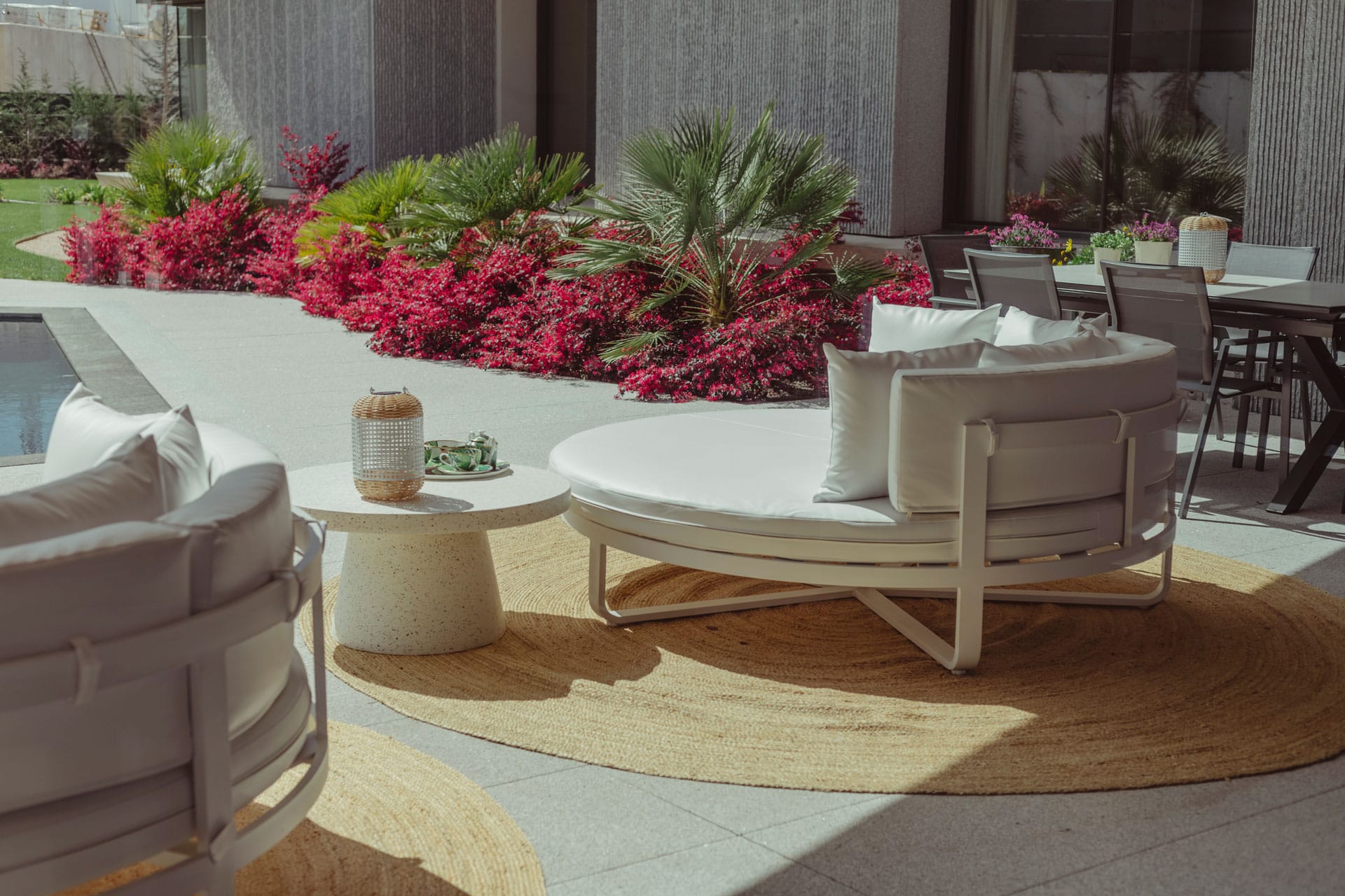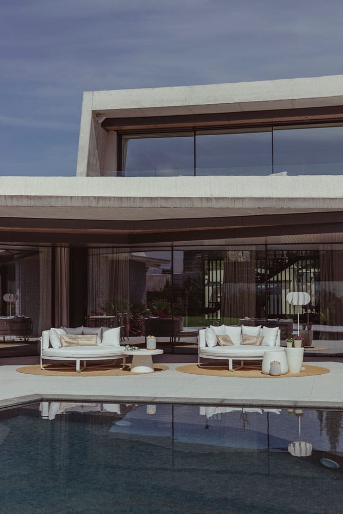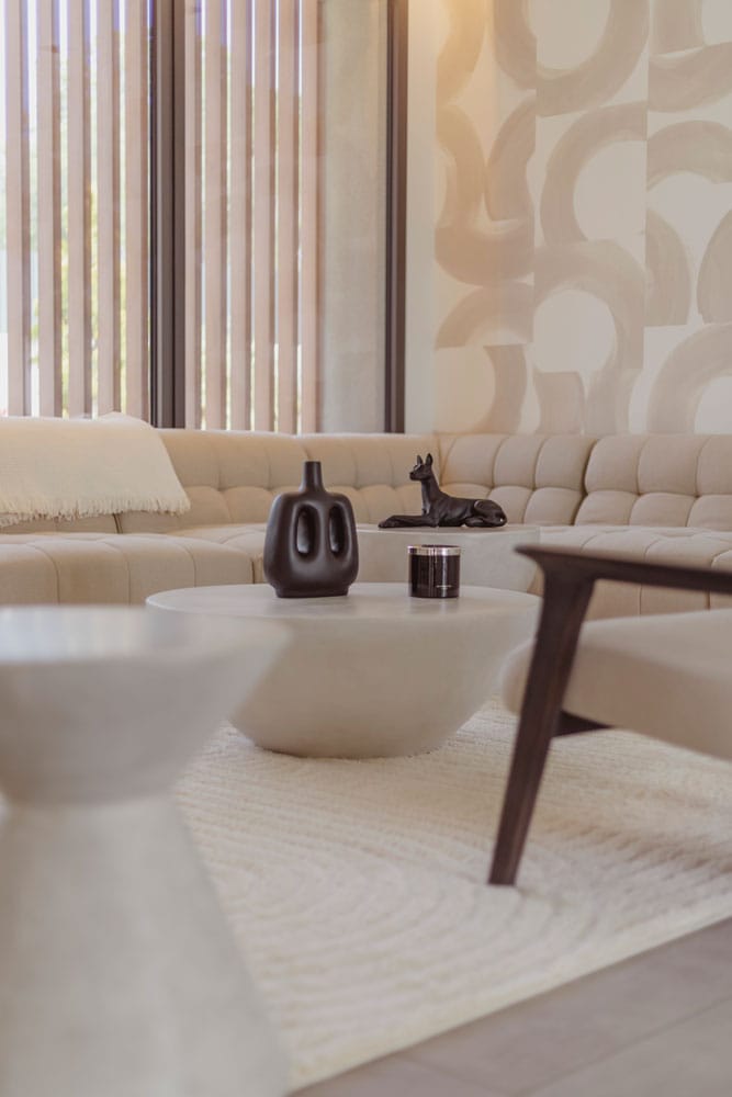 La arquitectura de esta casa es puramente minimalista, por lo que su decoración responde al mismo estilo, donde se ha buscado restar masculinidad, suavizar líneas y afeminar bajo un estilo MINIMALISTA CÁLIDO, a base de neutros , pasteles, líneas curvas, materiales y fibras naturales y mucha vegetación.