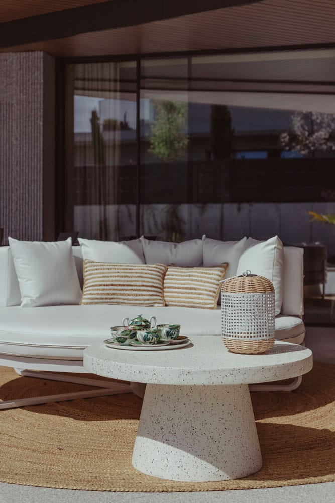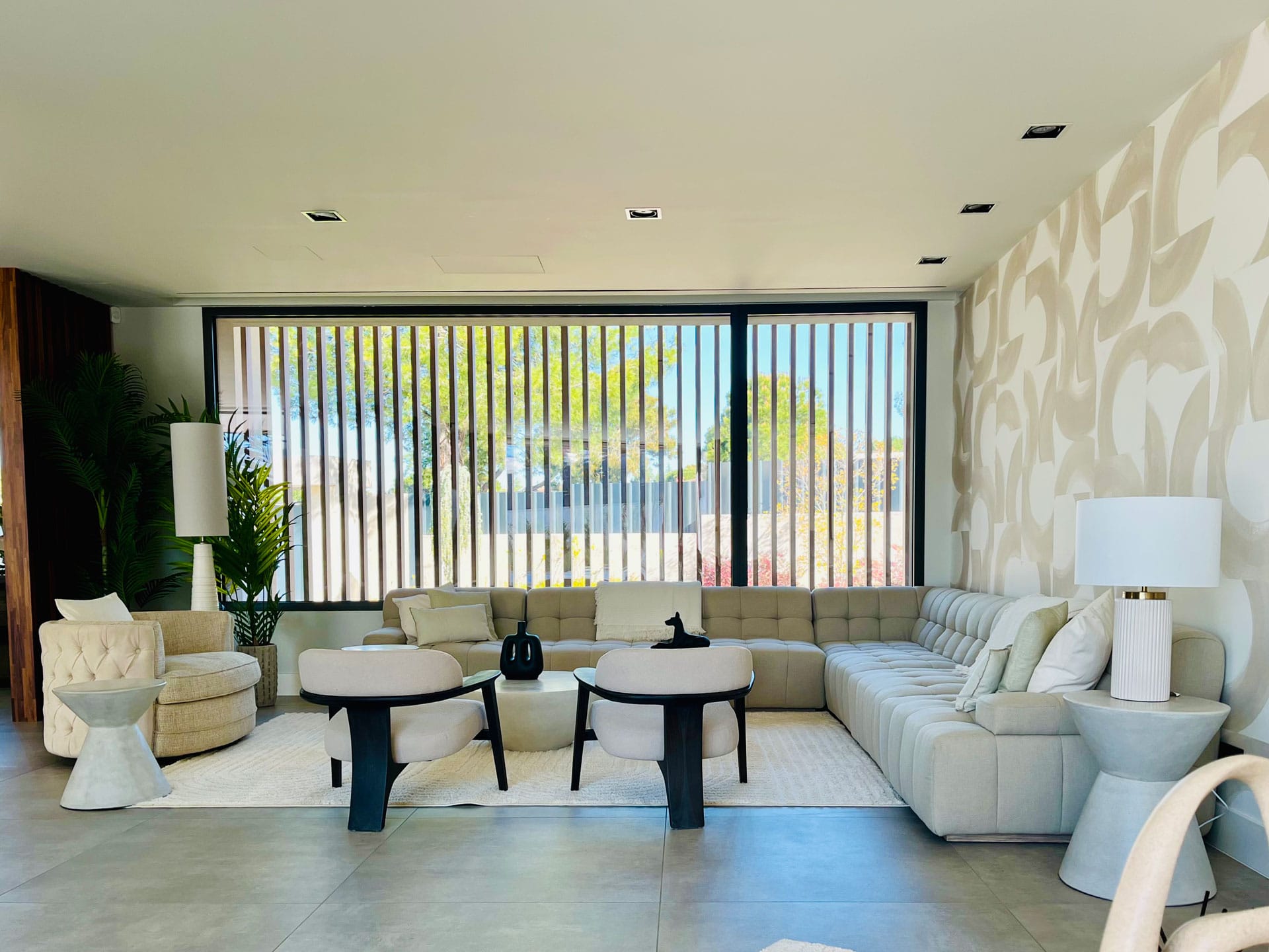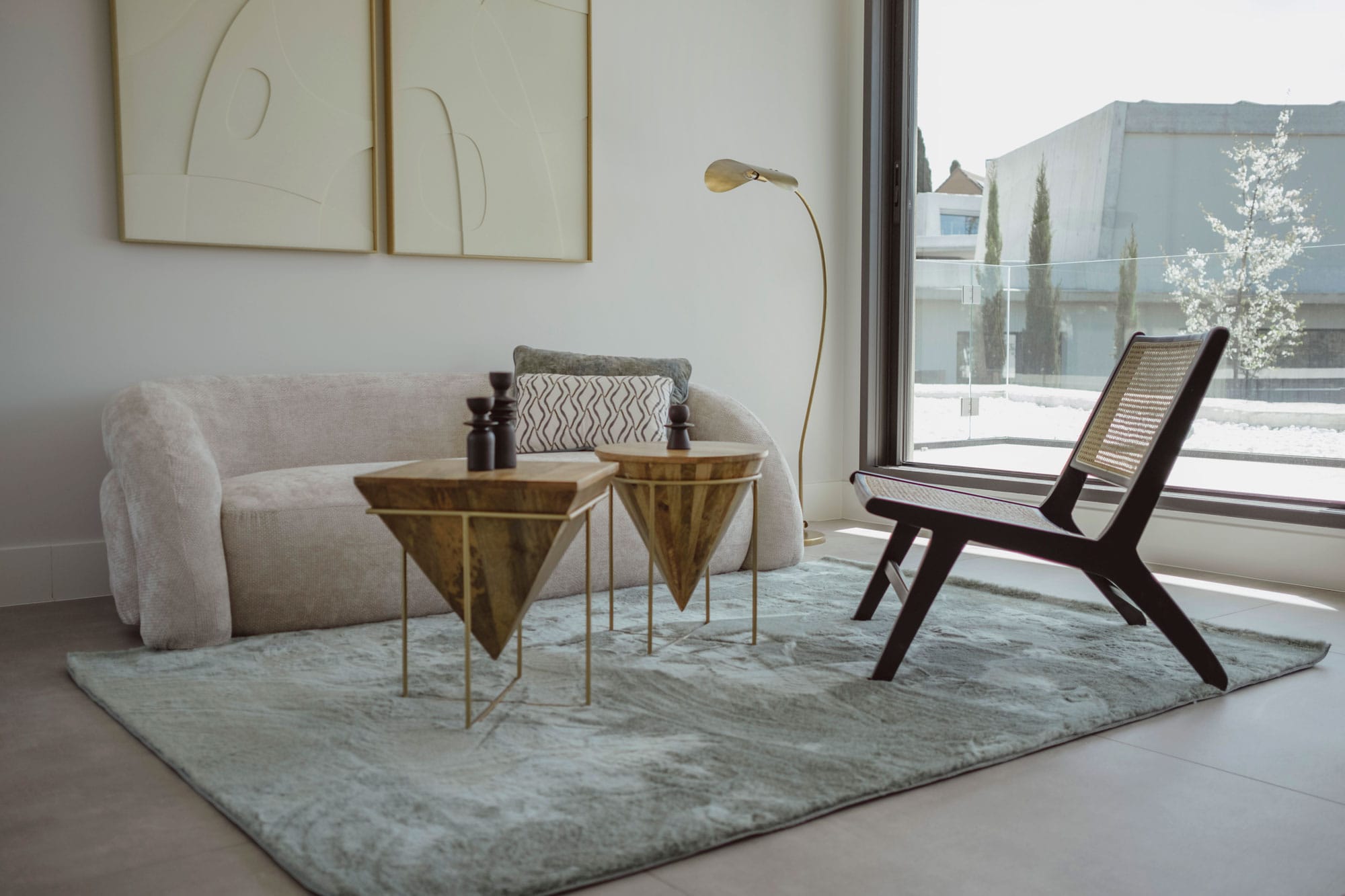La arquitectura de esta casa es puramente minimalista, por lo que su decoración responde al mismo estilo, donde se ha buscado restar masculinidad, suavizar líneas y afeminar bajo un estilo MINIMALISTA CÁLIDO, a base de neutros , pasteles, líneas curvas, materiales y fibras naturales y mucha vegetación.