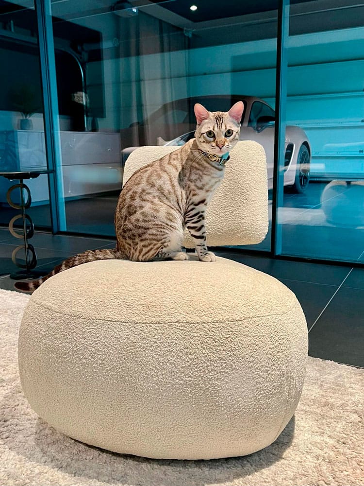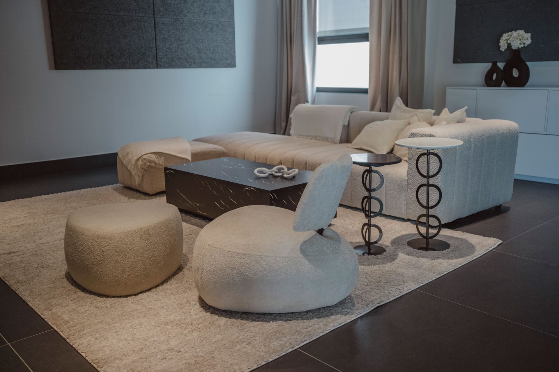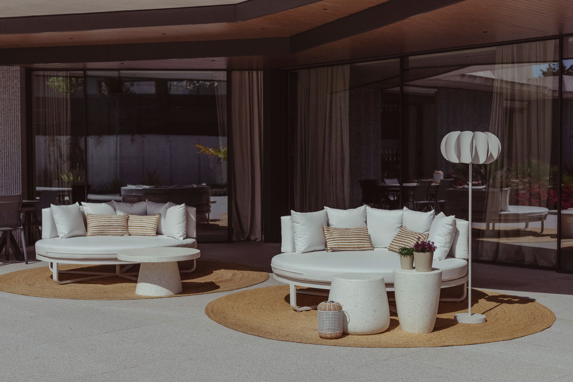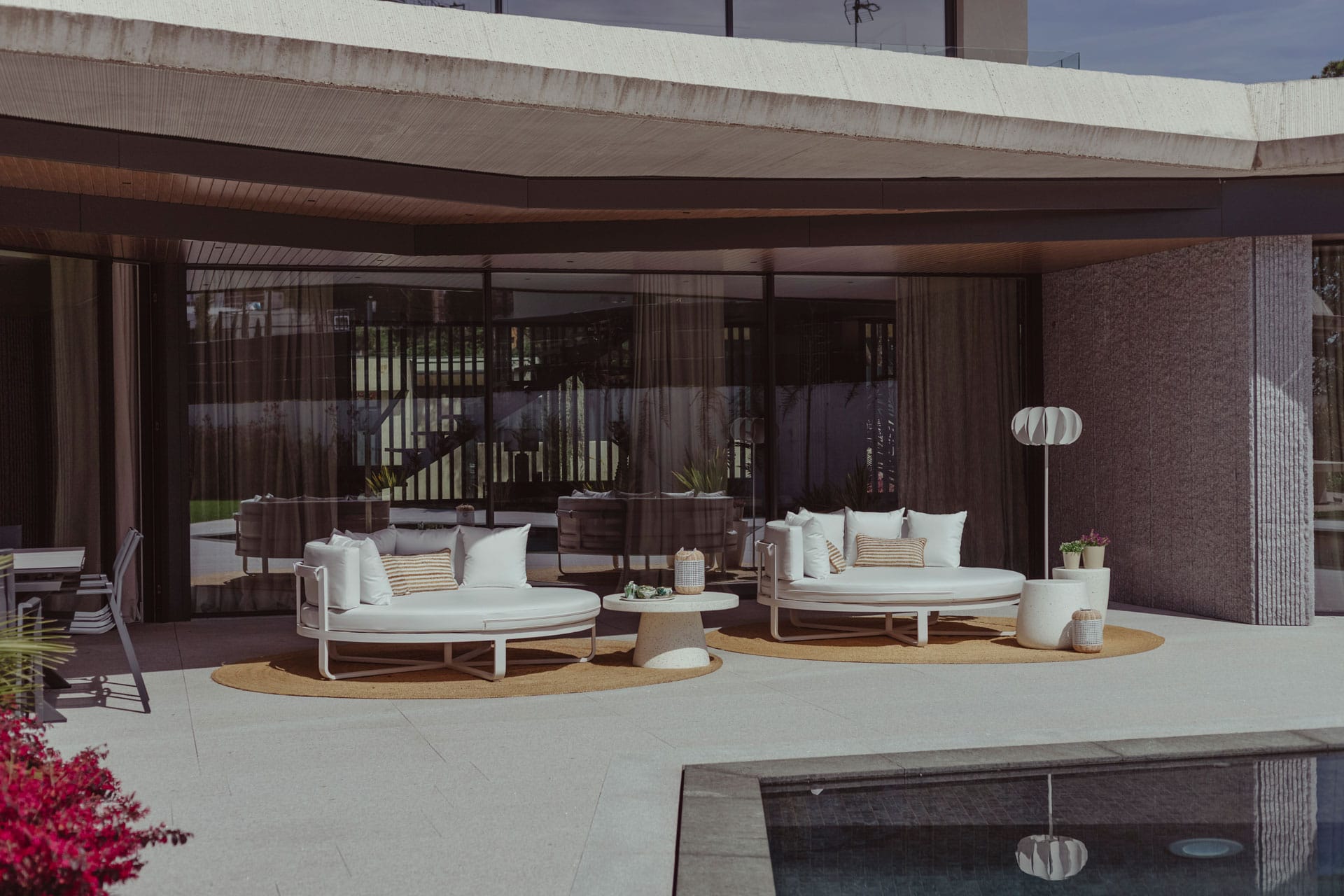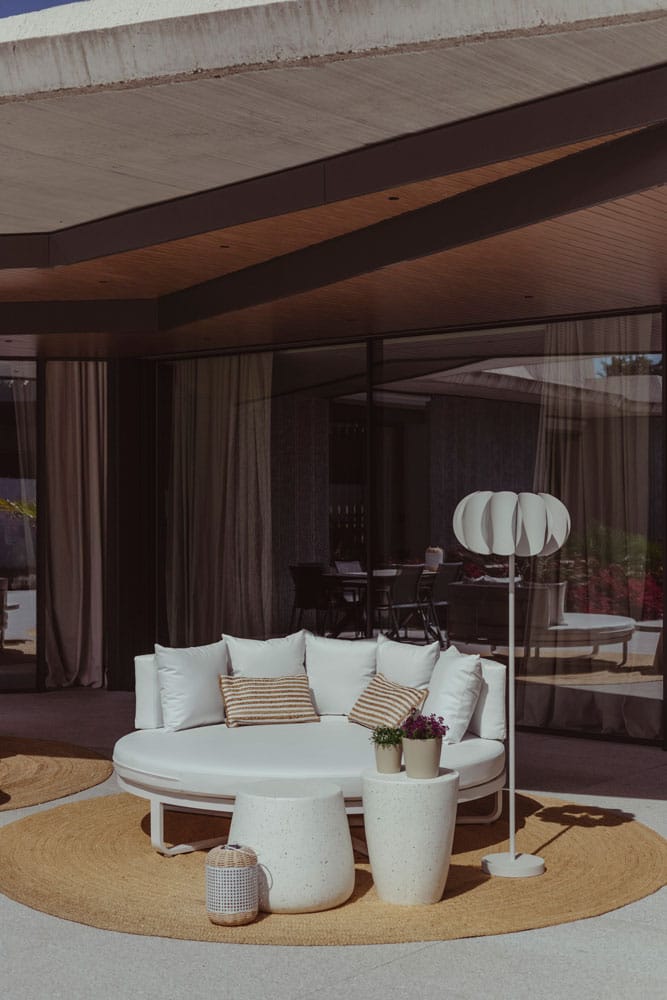 Los sofás redondos, las mesas de fibra de magnesio, las alfombras y su lámpara de pie refuerzan las líneas curvas aportando movimiento y sensualidad a su robusta arquitectura.