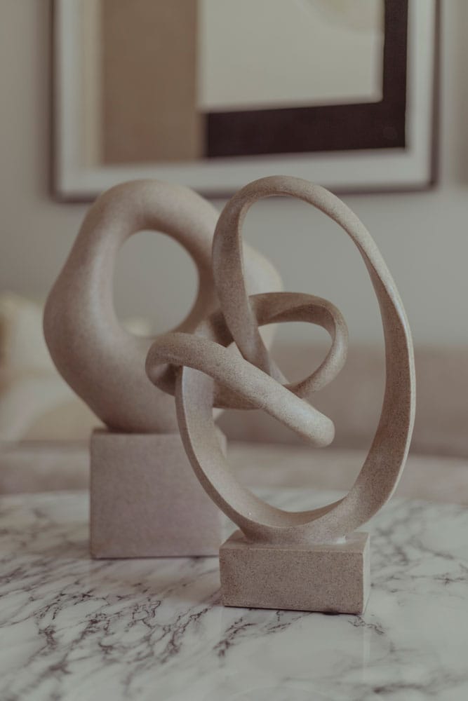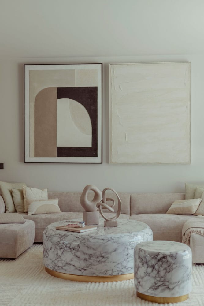 La zona de TV suaviza la estancia con sus texturas totalmente integradas, cuadros XL, figuras decorativas de resina e imitación mármol de sus mesas de centro contrarrestando la palillería y mueble negro de TV.