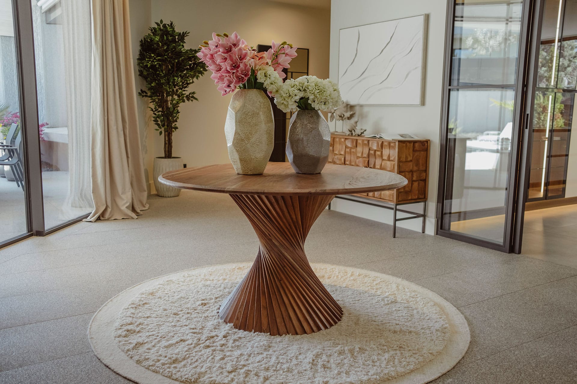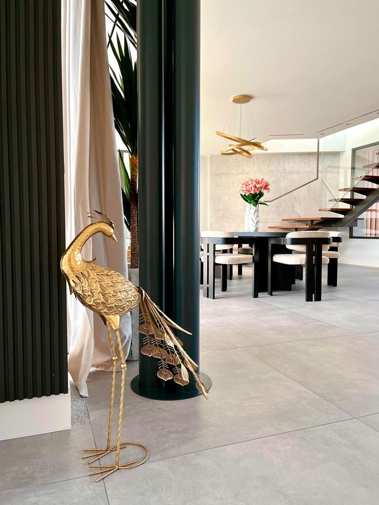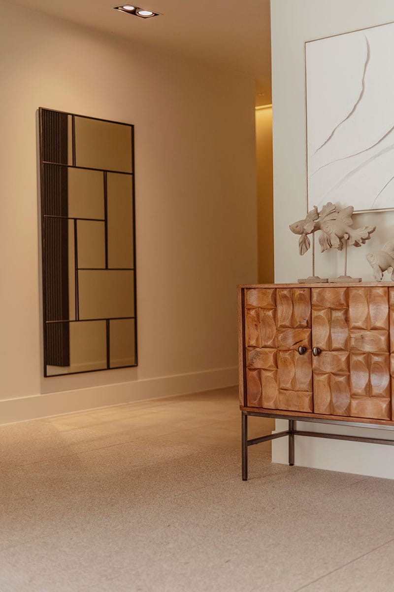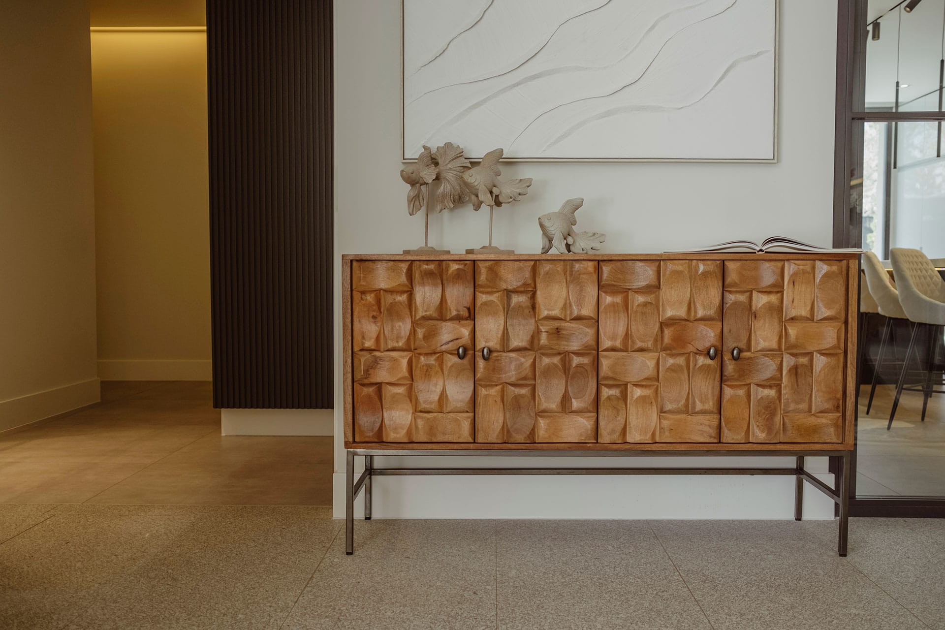 Comenzamos con un recibidor muy amplio con una mesa de lazo redonda de acacia con aparador a juego, cuadros abstractos y primeras figuras decorativas de animales, en este caso peces.