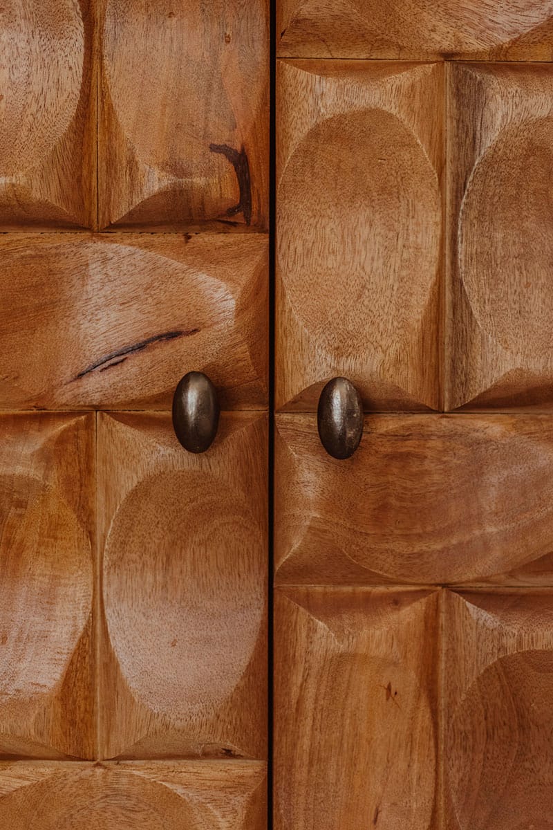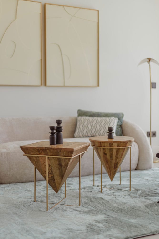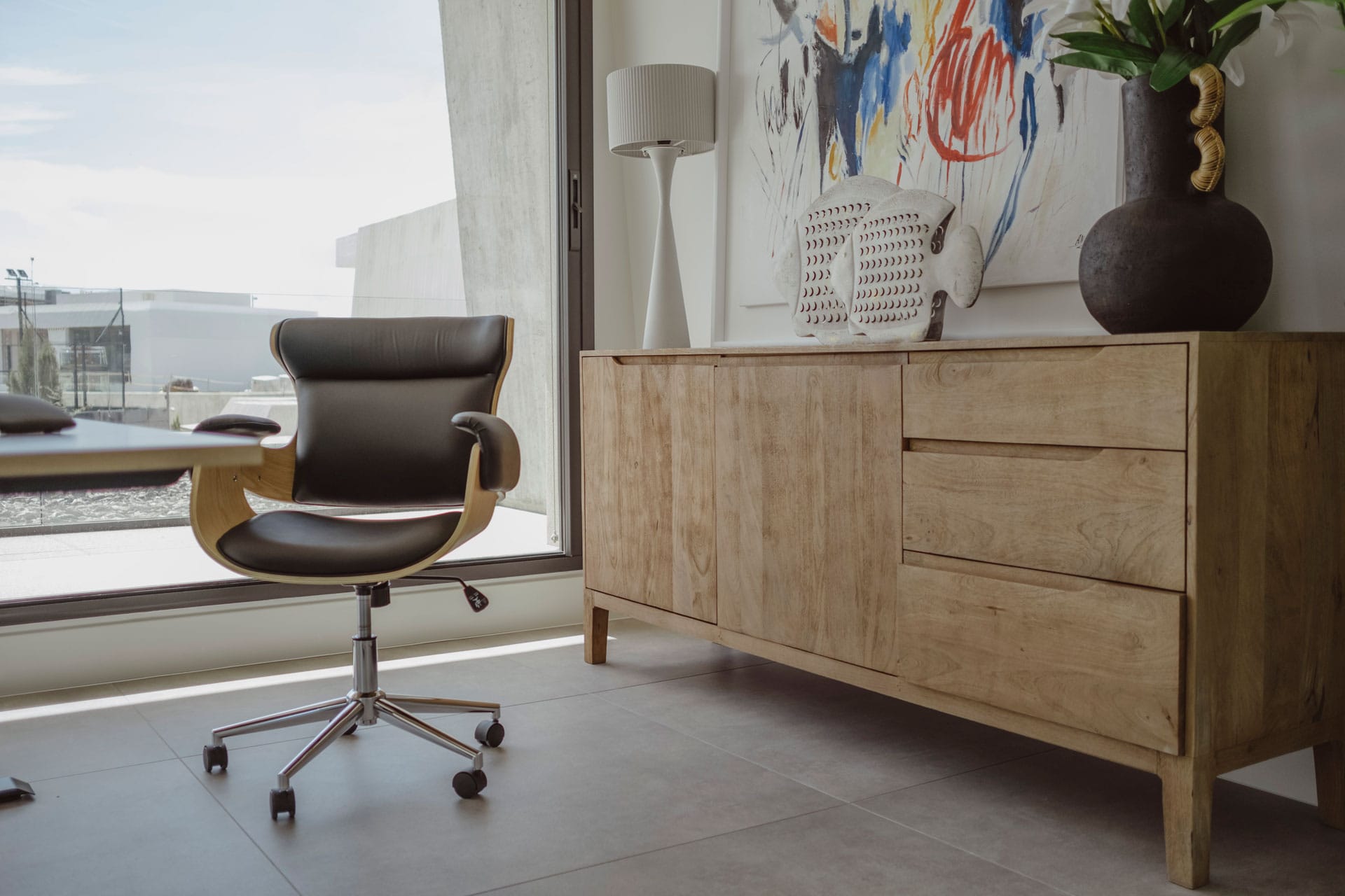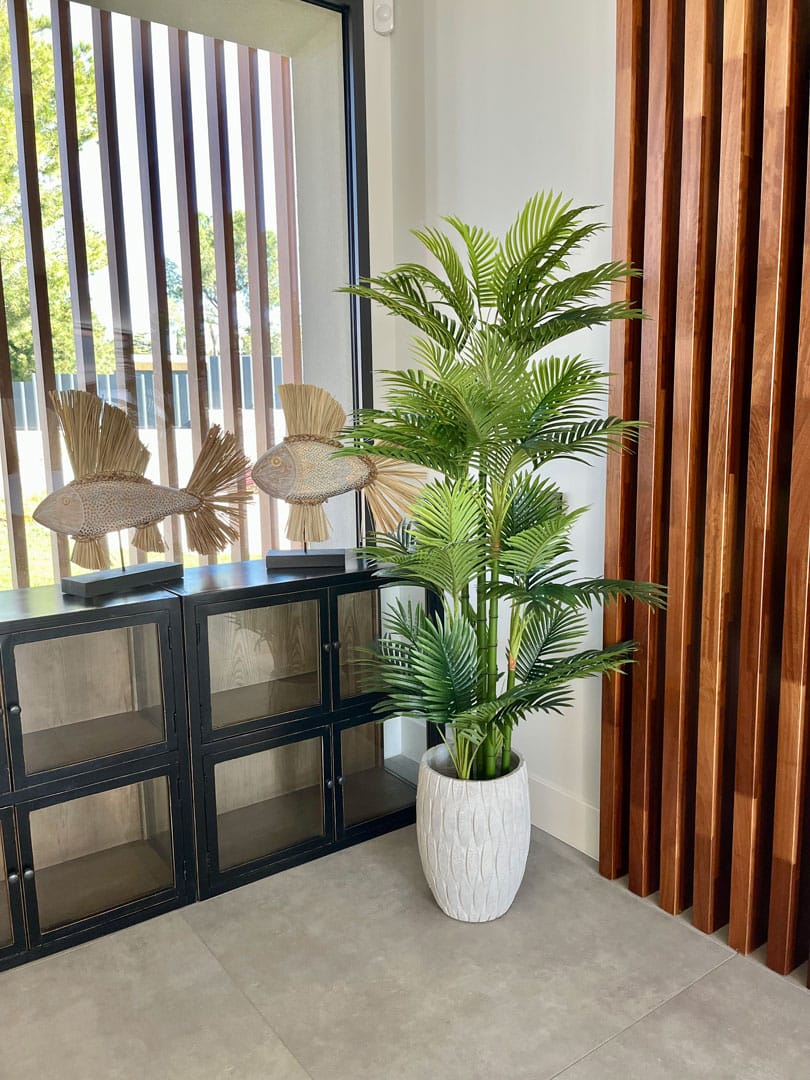 Comenzamos con un recibidor muy amplio con una mesa de lazo redonda de acacia con aparador a juego, cuadros abstractos y primeras figuras decorativas de animales, en este caso peces.