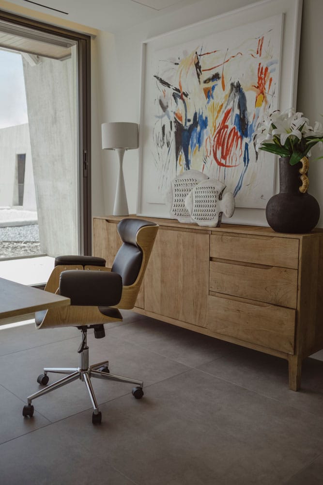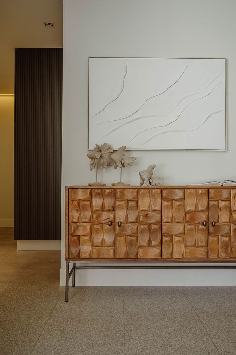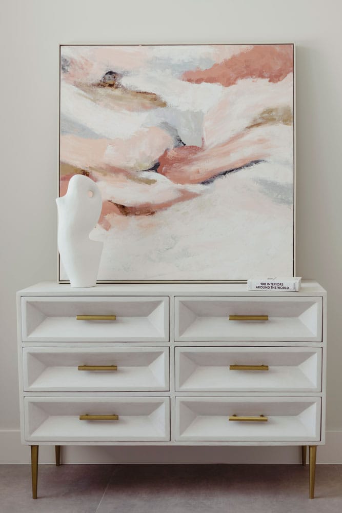 Destacar el cuadro abstracto pintado a mano apoyado en el aparador.