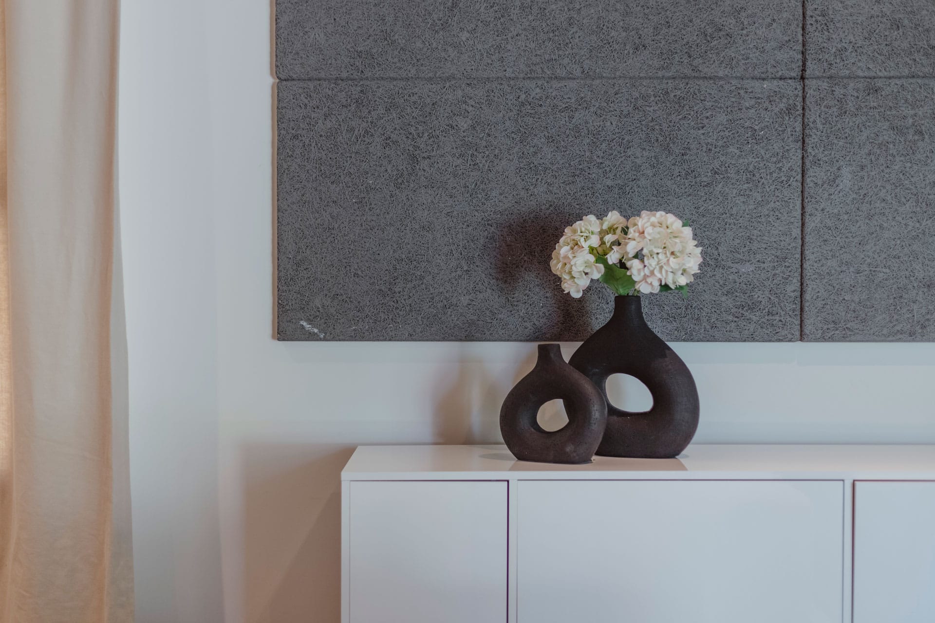 Sala de cine con techo y paneles de insonorización contrastan con una decoración elegante y minimalista que aporta luz a esta estancia caracterizadapor su oscuridad y su cristalera al garaje.