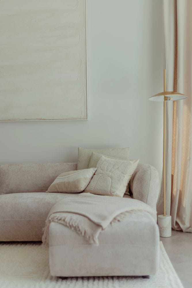 Resaltar sofá y sillón de líneas depuradas, modernas y de texturas acogedoras.