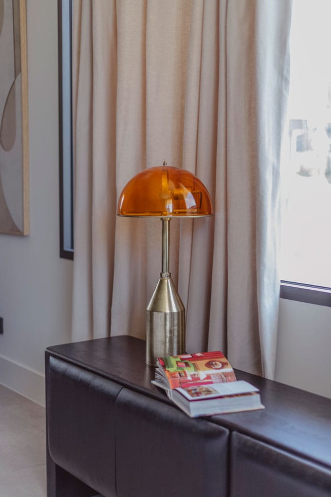 Son destacables sus lámparas vintage en dorado y naranja que aportan luz a este espacio bicolor de tanto carácter.