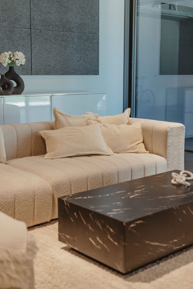 Sala de cine con techo y paneles de insonorización contrastan con una decoración elegante y minimalista que aporta luz a esta estancia caracterizada por su oscuridad y su cristalera al garaje.