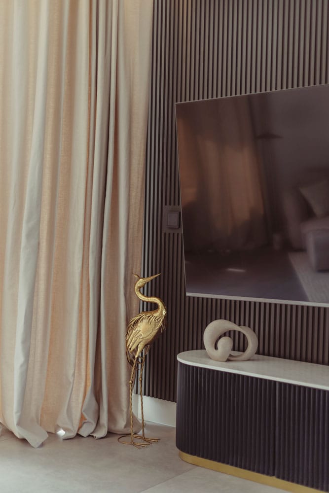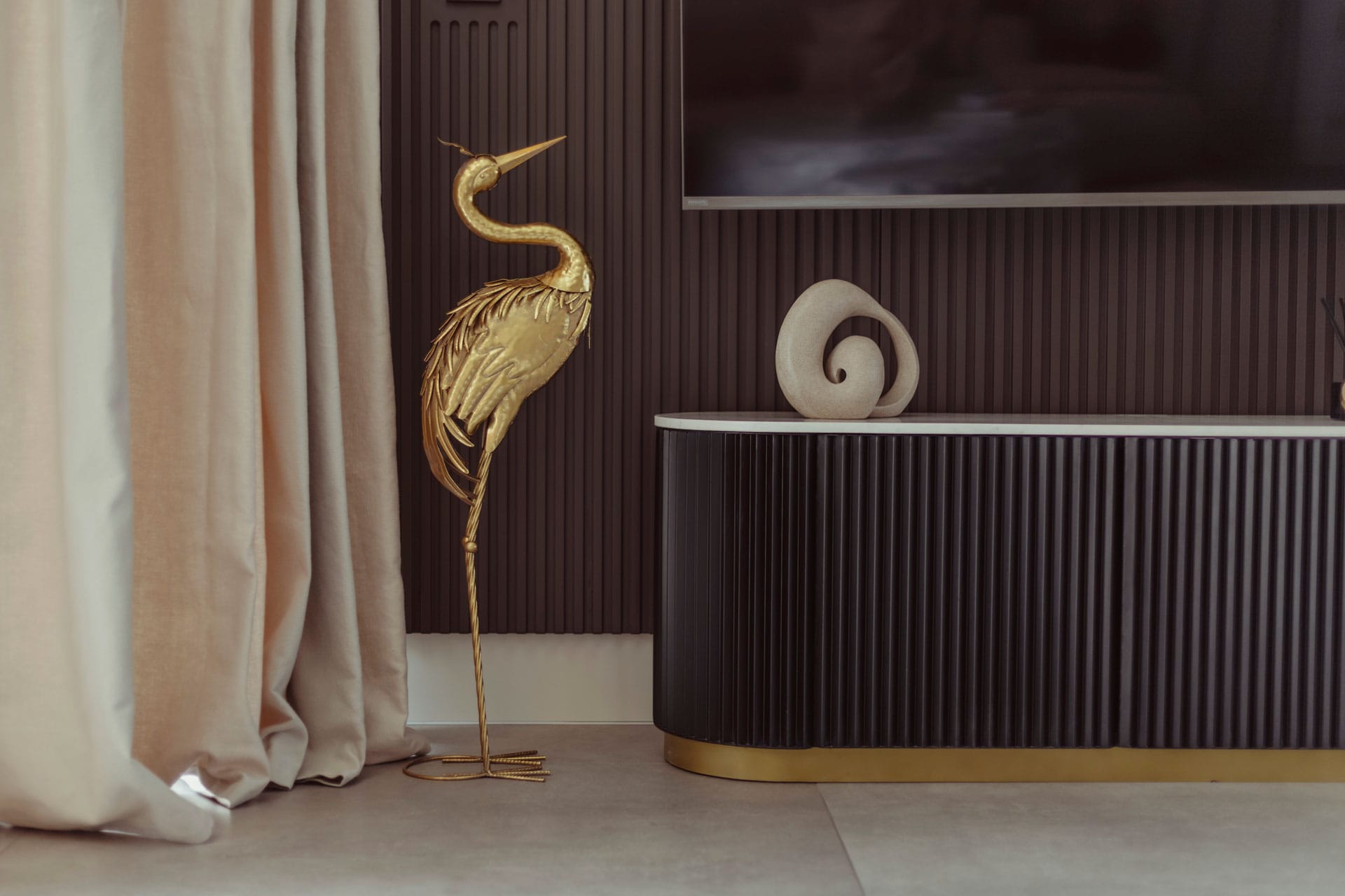 Figuras decorativas de garza y pavo real enmarcan el mueble de TV. La televisión está colgada del techo con refuerzo en el pladur.