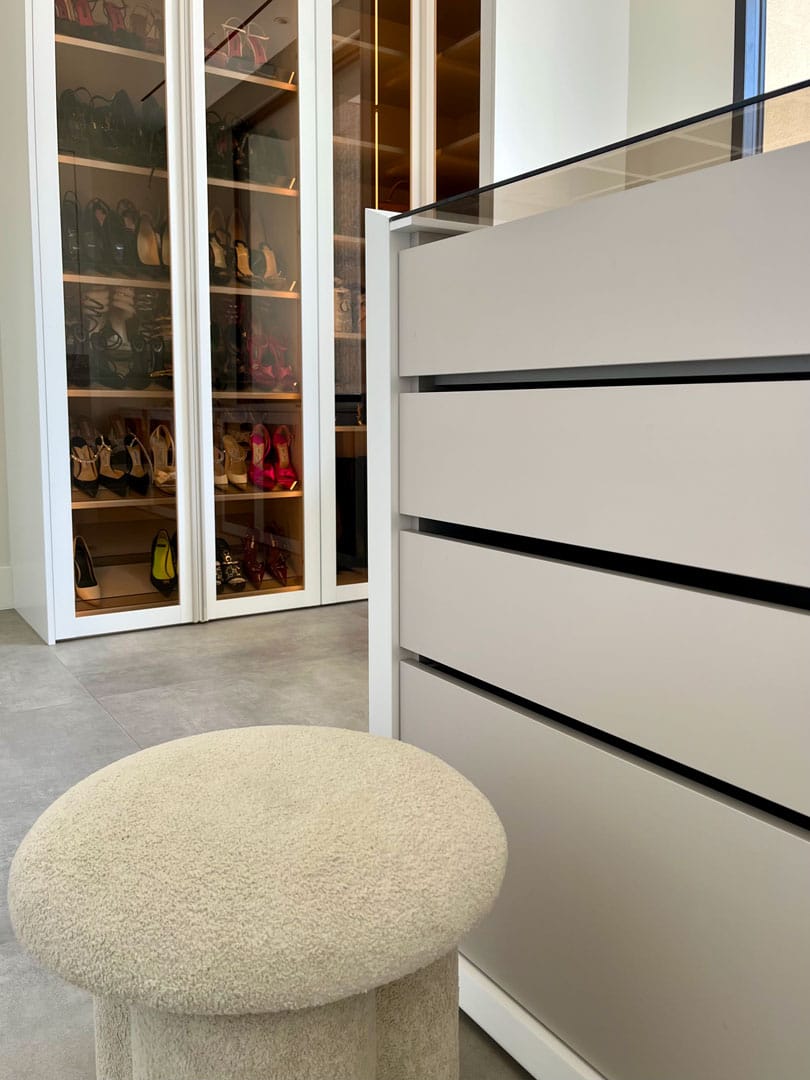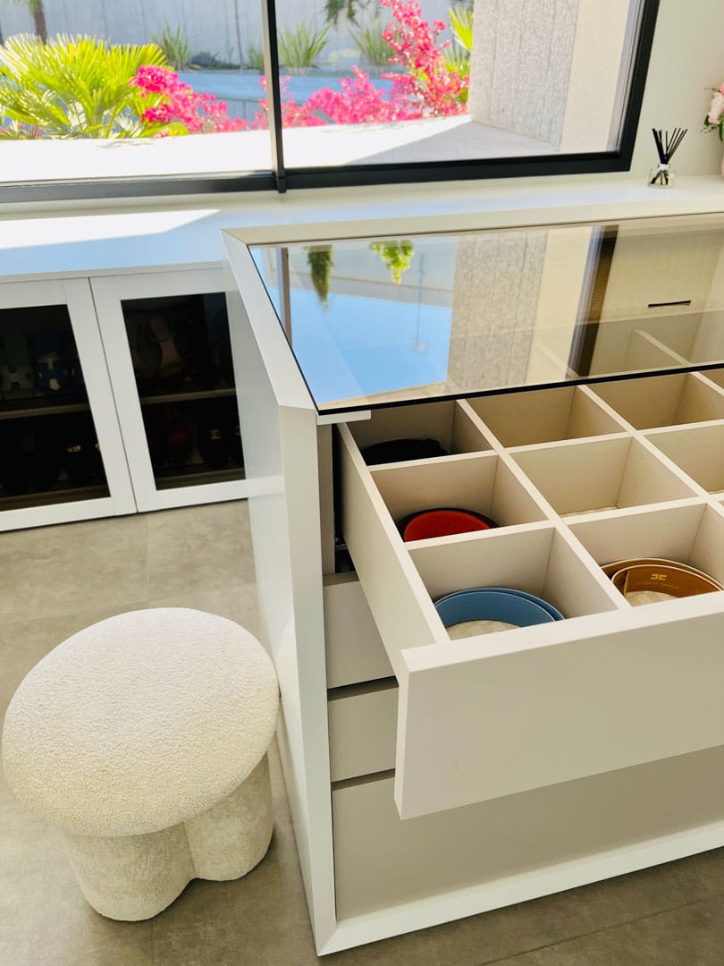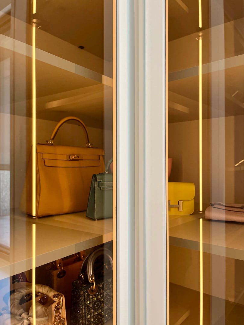 Habitación vestidor dedicada exclusivamente para bolsos y zapatos, con isla para cinturones, bolsos de fiesta y joyero.
