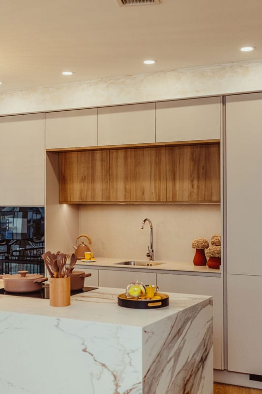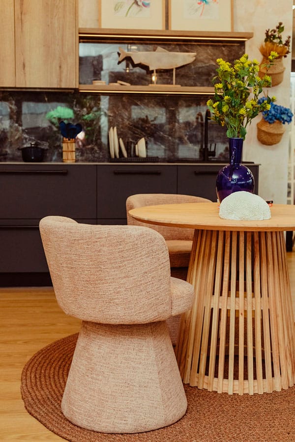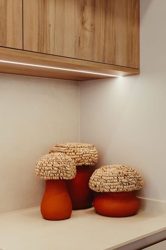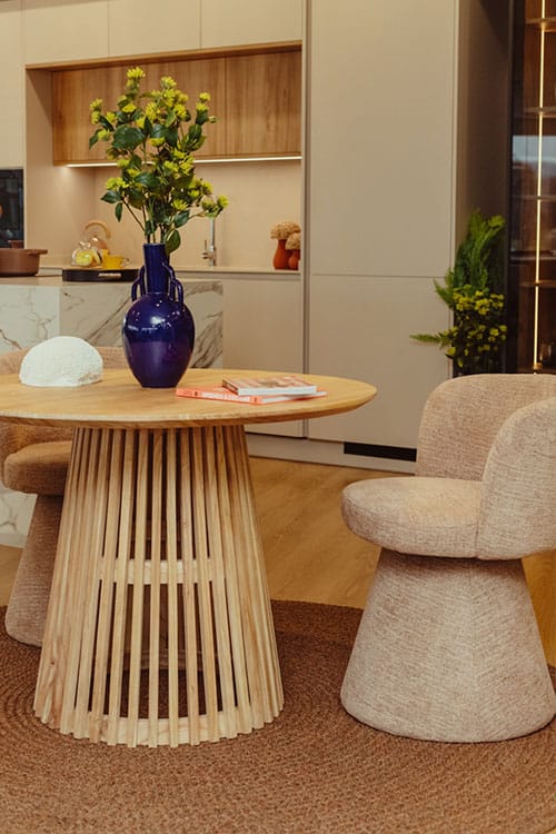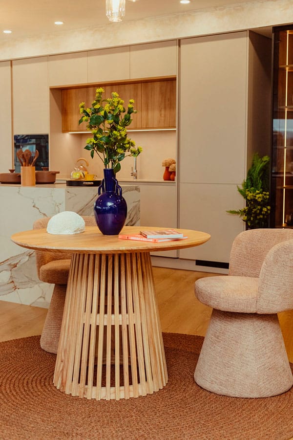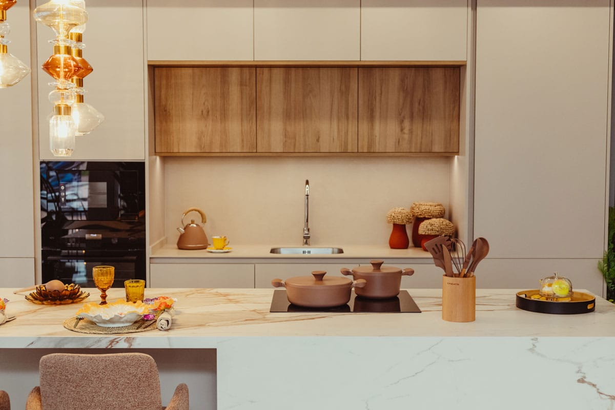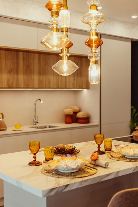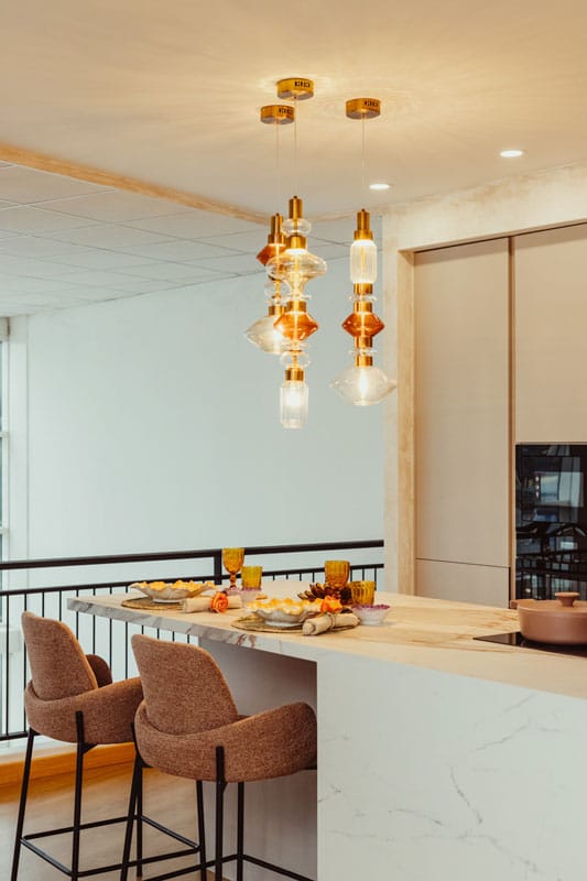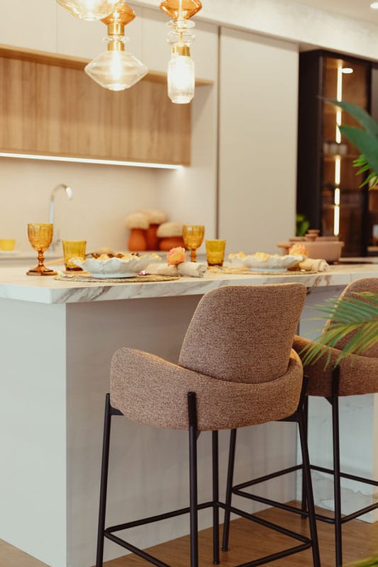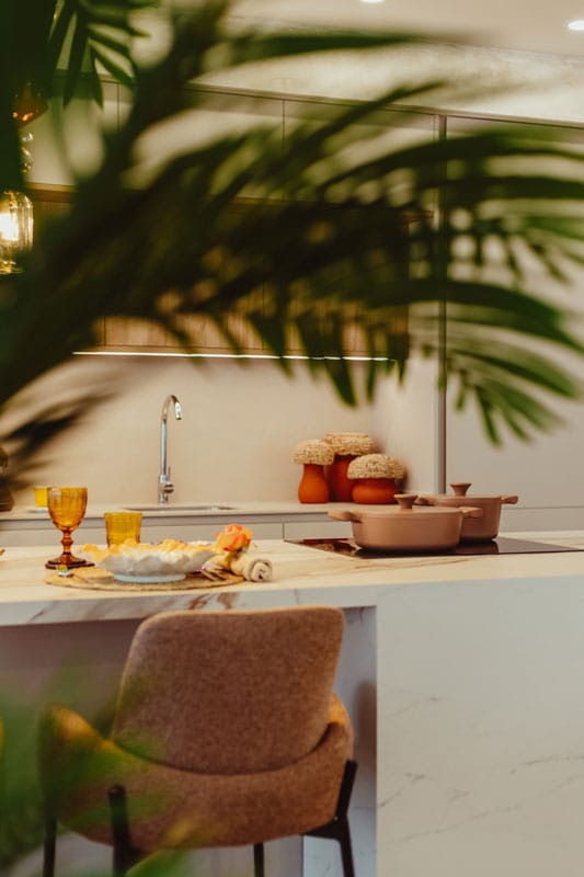 Cocina Crème con puertas Cashemire SM y cuarzo Calacatta Macon, ha sido decorada con lámparas de cristal art déco, taburetes a juego con las sillas del office de Noir, batería de cocina en Mocha Mousse y setas en terracota y rafia.