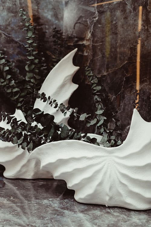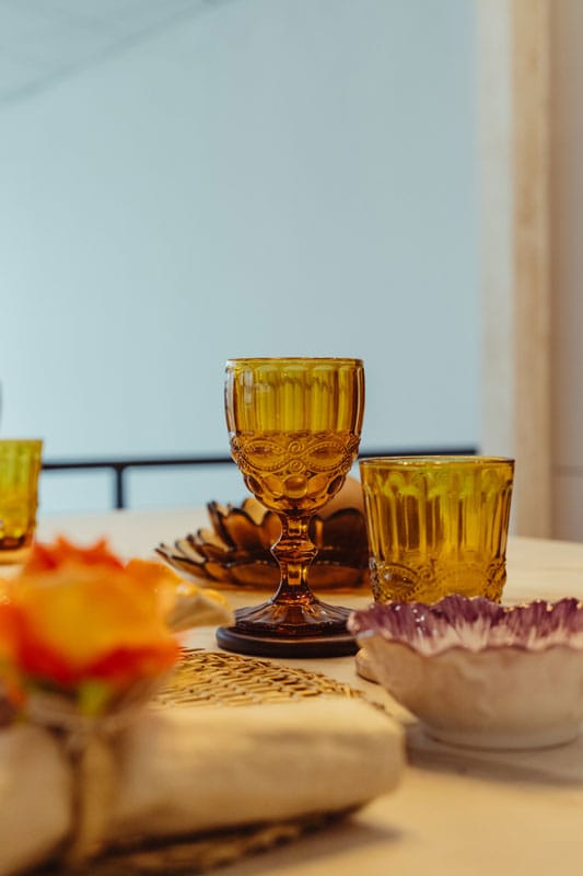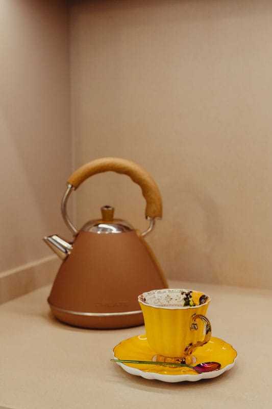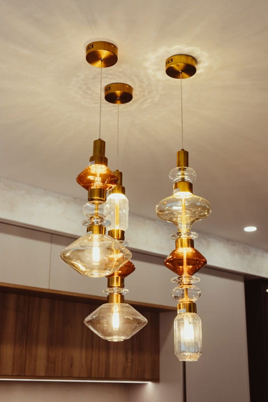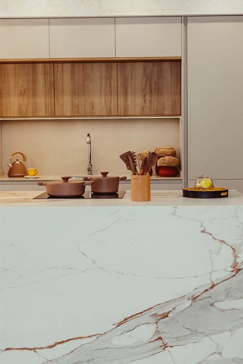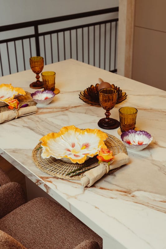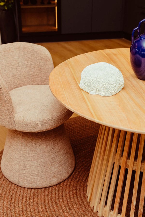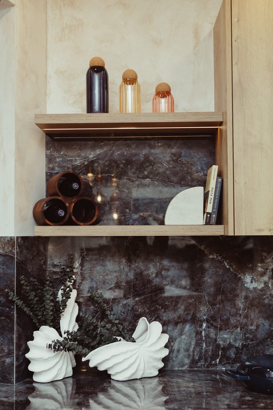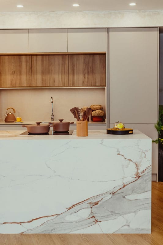 Cocina Crème con puertas Cashemire SM y cuarzo Calacatta Macon, ha sido decorada con lámparas de cristal art déco, taburetes a juego con las sillas del office de Noir, batería de cocina en Mocha Mousse y setas en terracota y rafia.