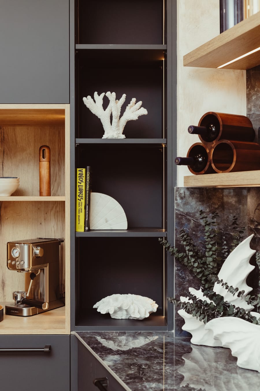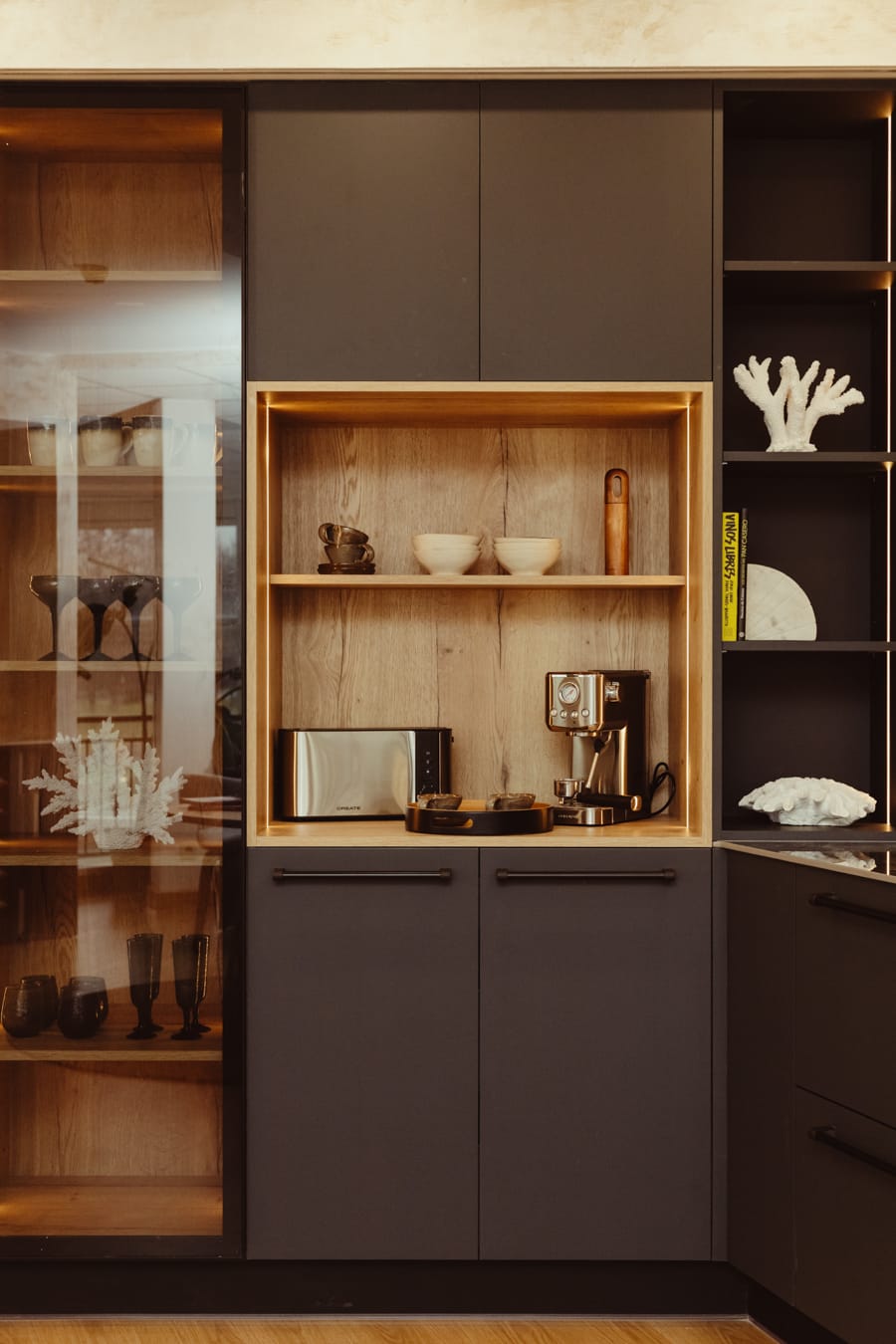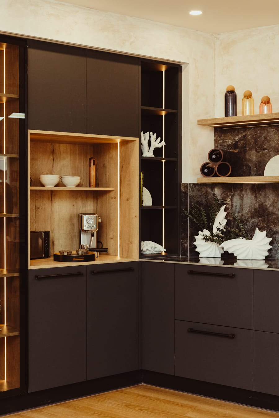 Cocina Noir del proyecto Éclair para Naturia Kitchen parte con puertas en Carbono Sm, desayunador de Roble Gold y mármol Emperador.