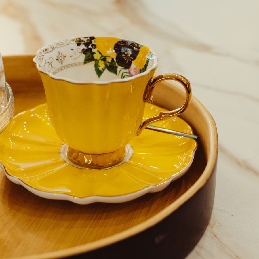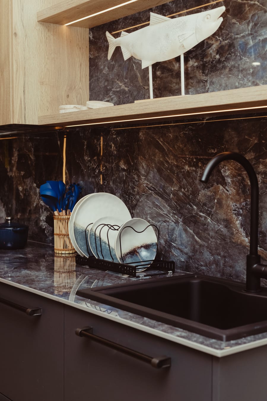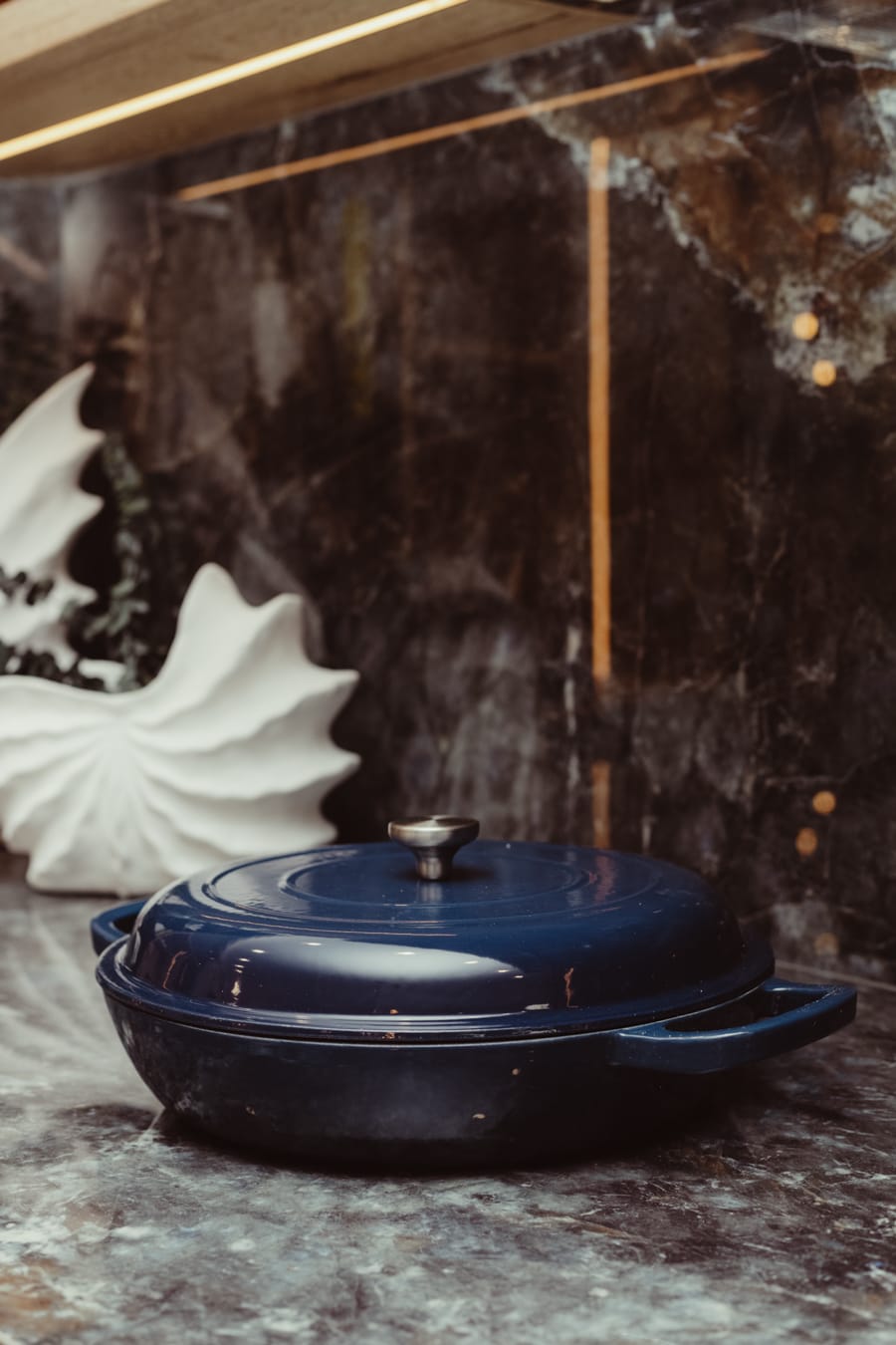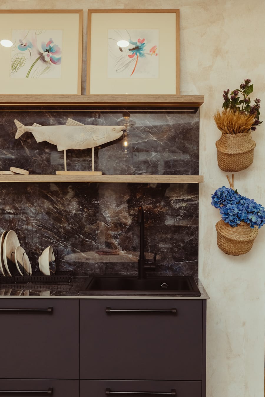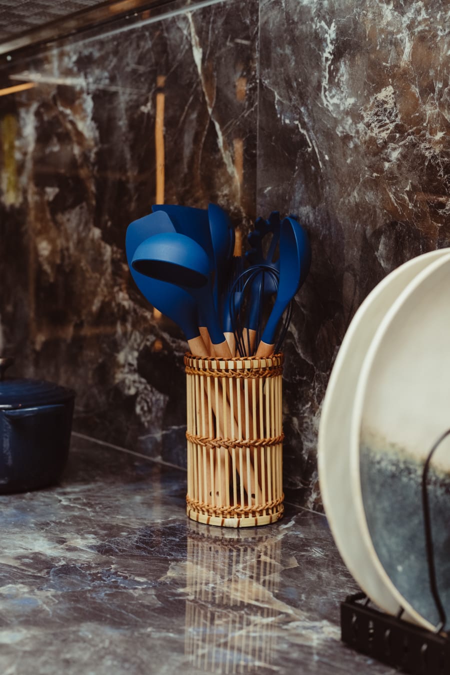 «Resaltar las tazas de barro, botellero y sujetalibros de mármol y cuadros pintados a mano de tonos azules..»