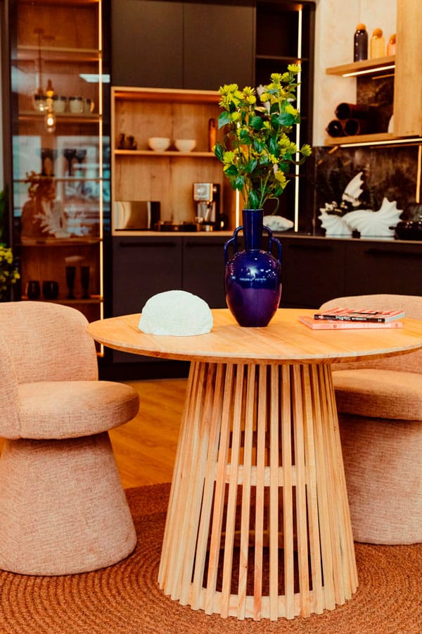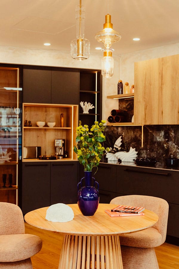 Office con estilosas lámparas colgantes art déco y sillas giratorias a modo de zona de espera con libros de cocina y jarrón a juego con batería de cocina Noir.