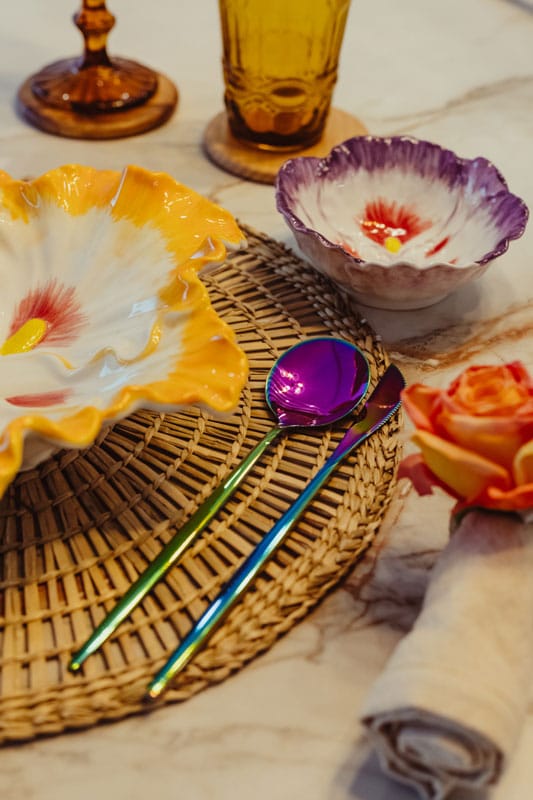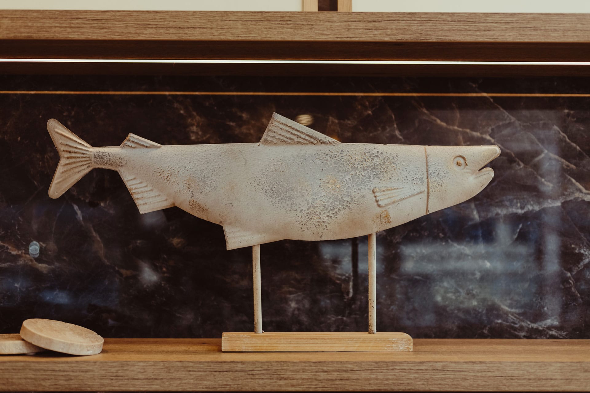 «Esta combinación de carácter intenso ha sido decorada con blancos corales y esponjas, pez blanco rozado y vajilla de gres esmaltada beige y azul dándole un aire marítimo..»