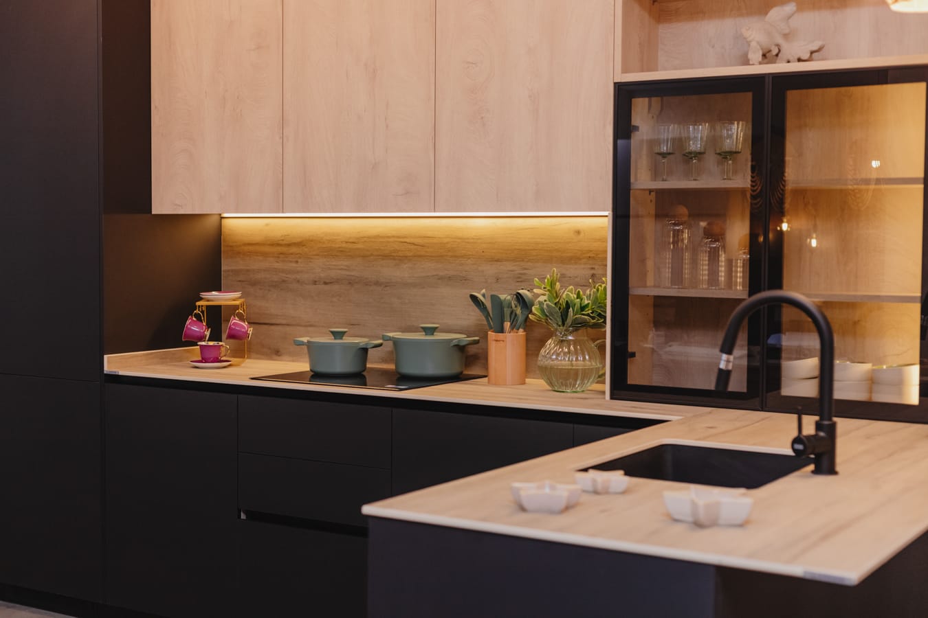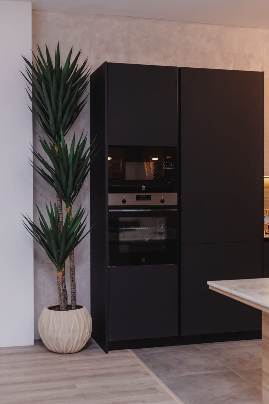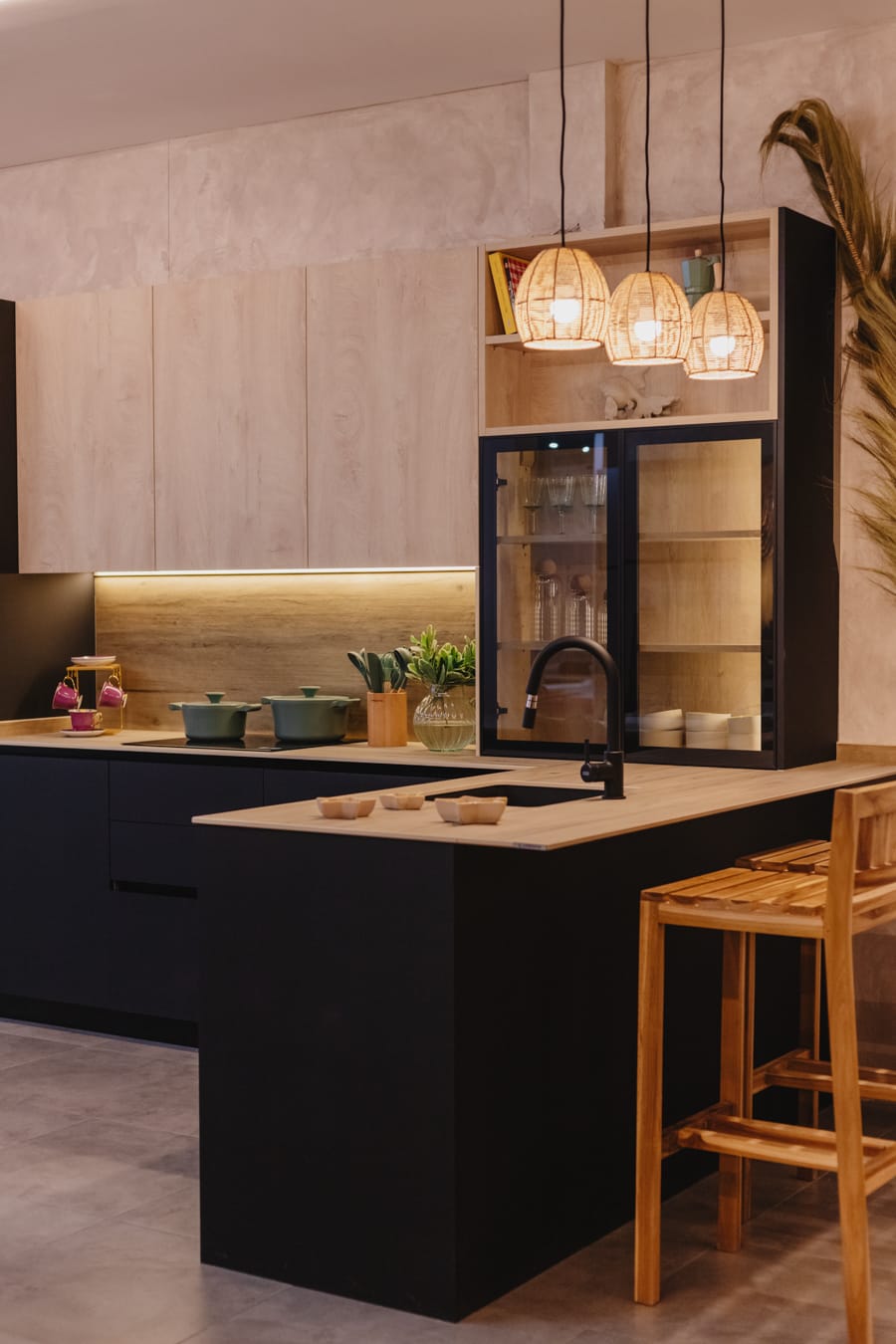 Es una cocina masculina y elegante de líneas puras y combinación bitono con encimera de piedra sinterizada Legno Venezia Sabbia , puertas Roble Elegance y vitrina en negro.