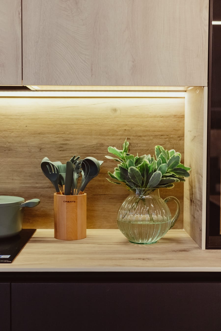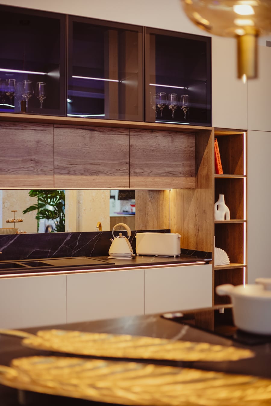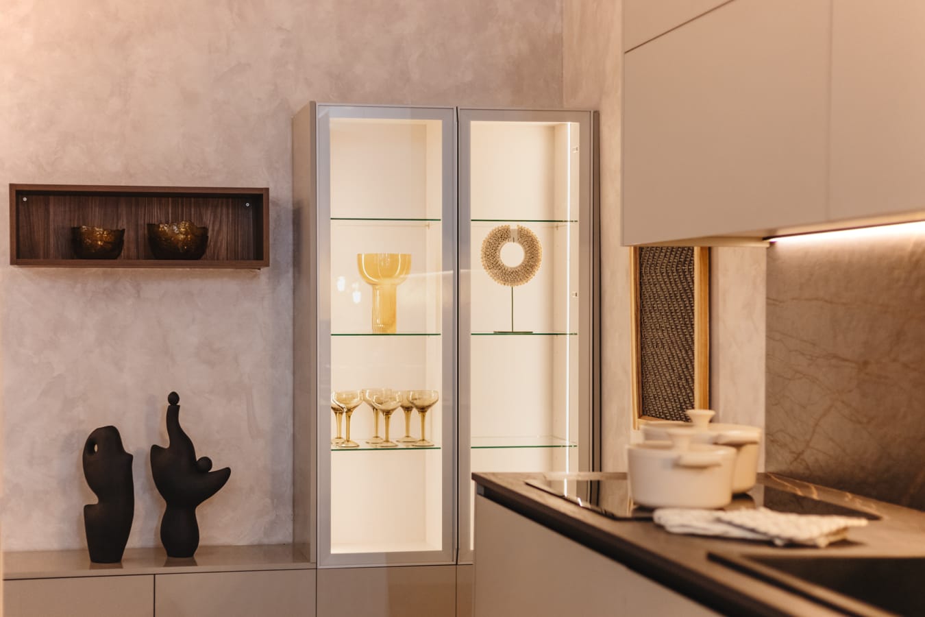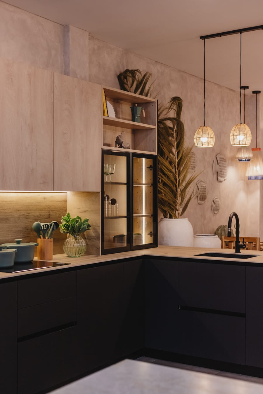 Es una cocina masculina y elegante de líneas puras y combinación bitono con encimera de piedra sinterizada Legno Venezia Sabbia , puertas Roble Elegance y vitrina en negro.