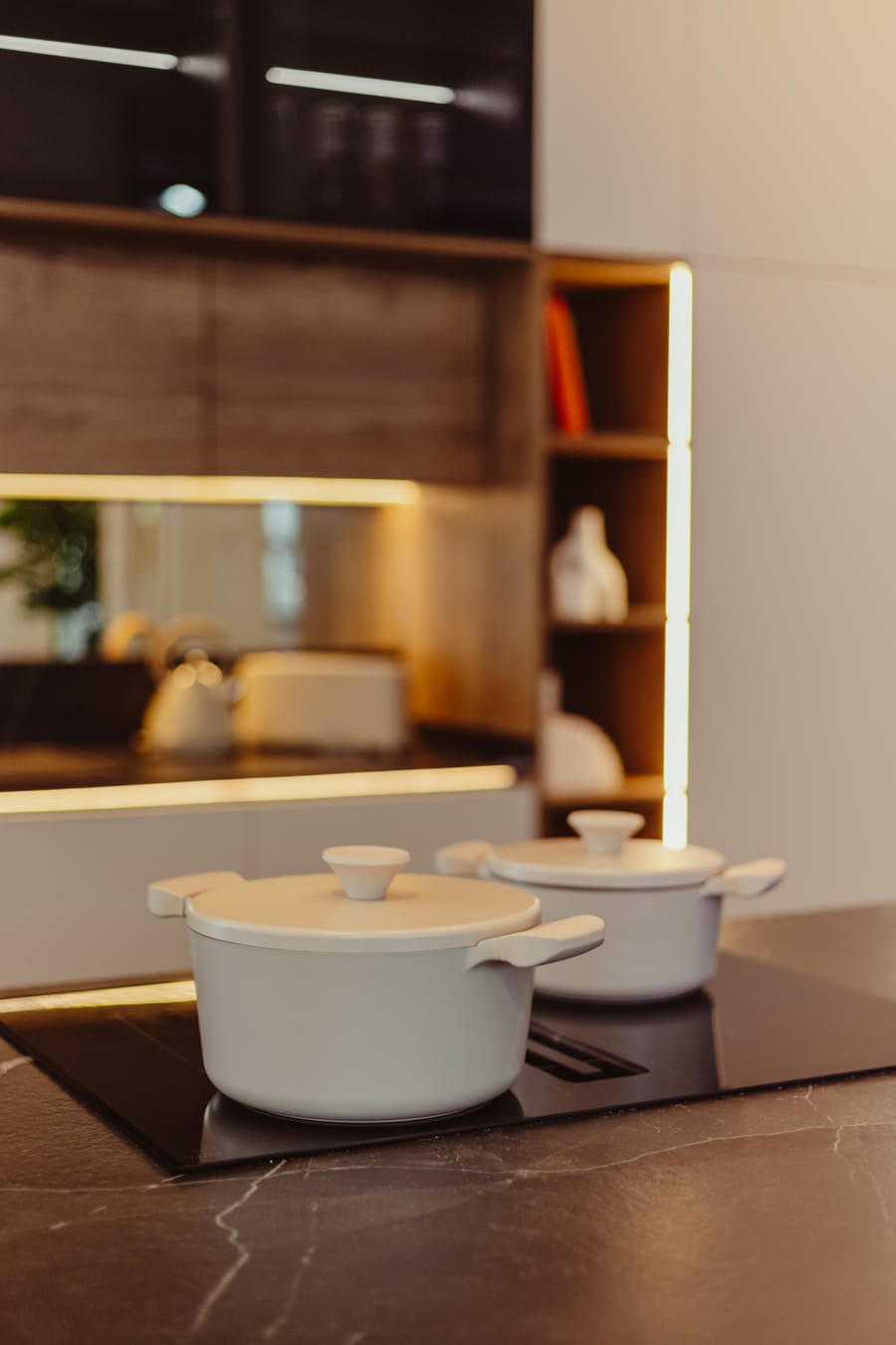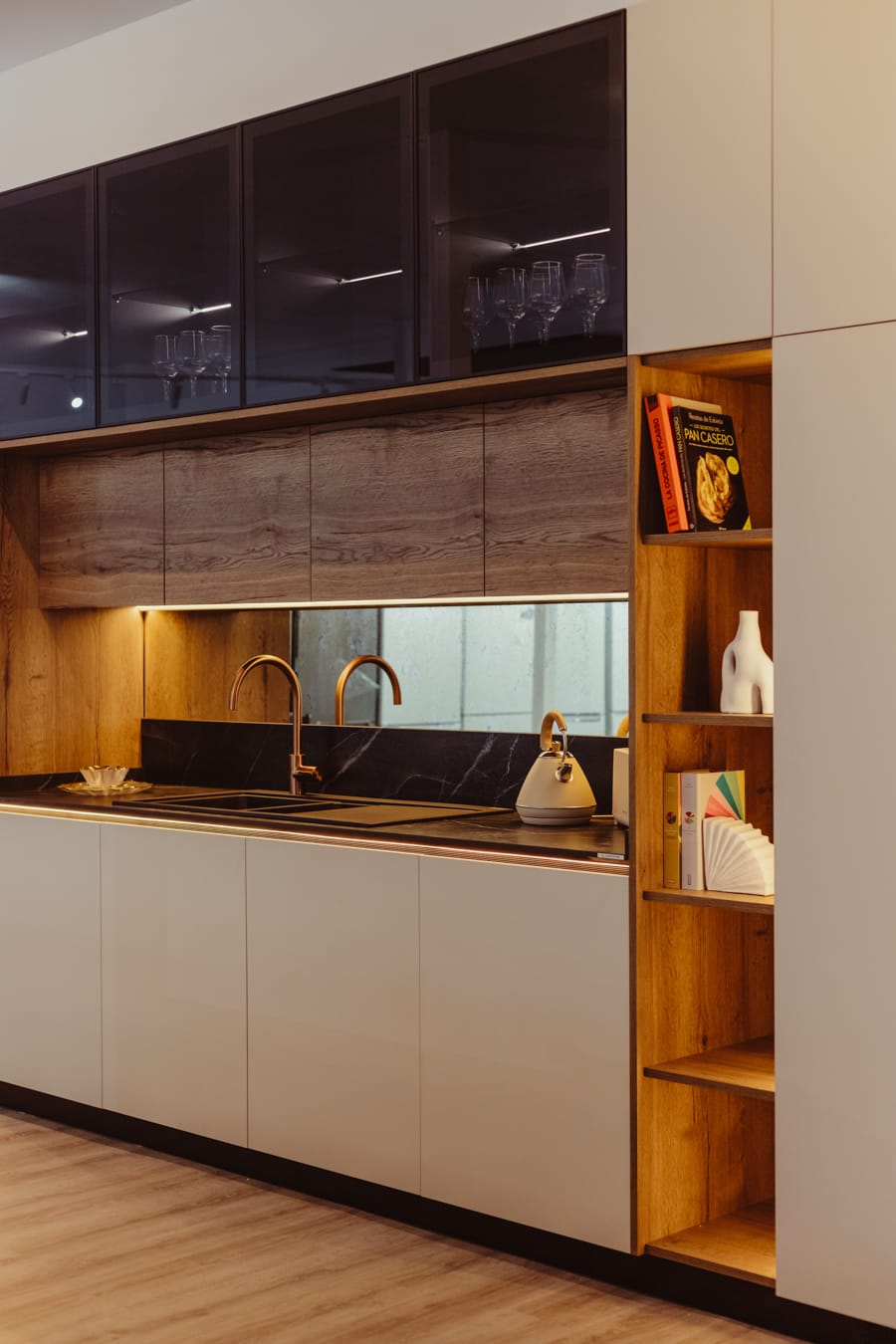 La encimera negra de piedra sinterizada es Calacatta Black Bocciardato, las puertas Cashemire Sm, y las estanterías en Roble Hálifax Tabaco.
