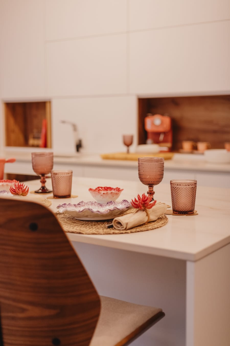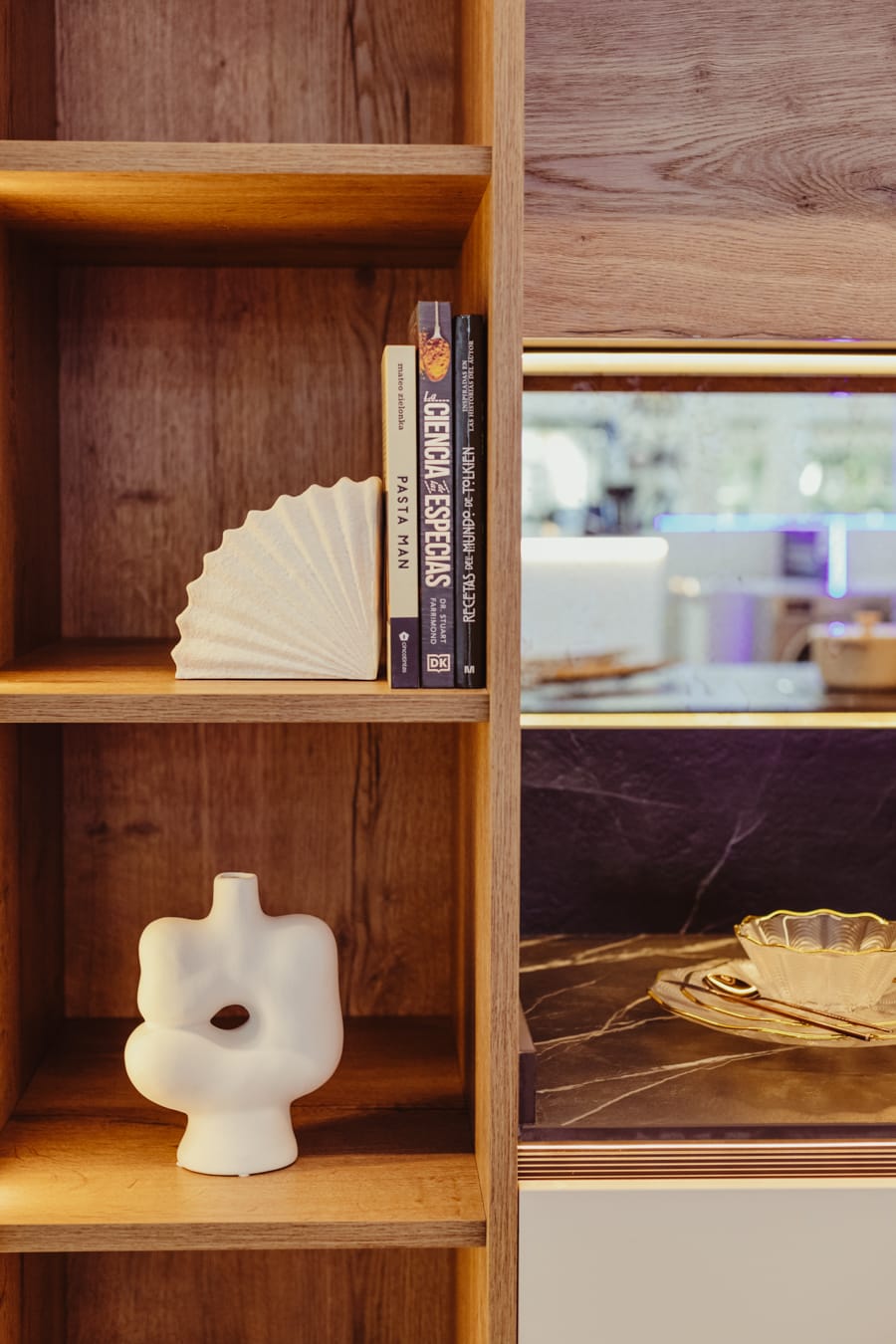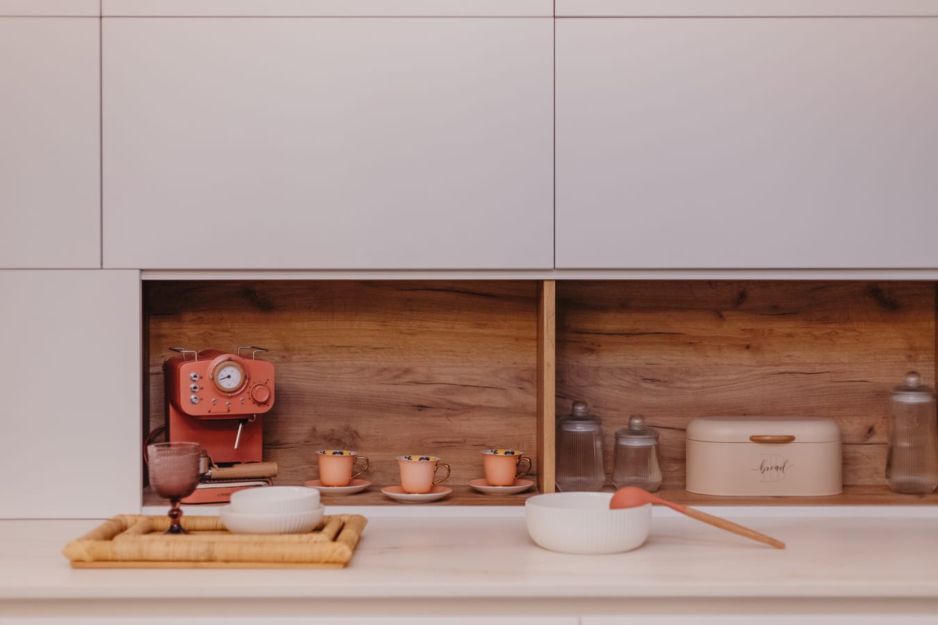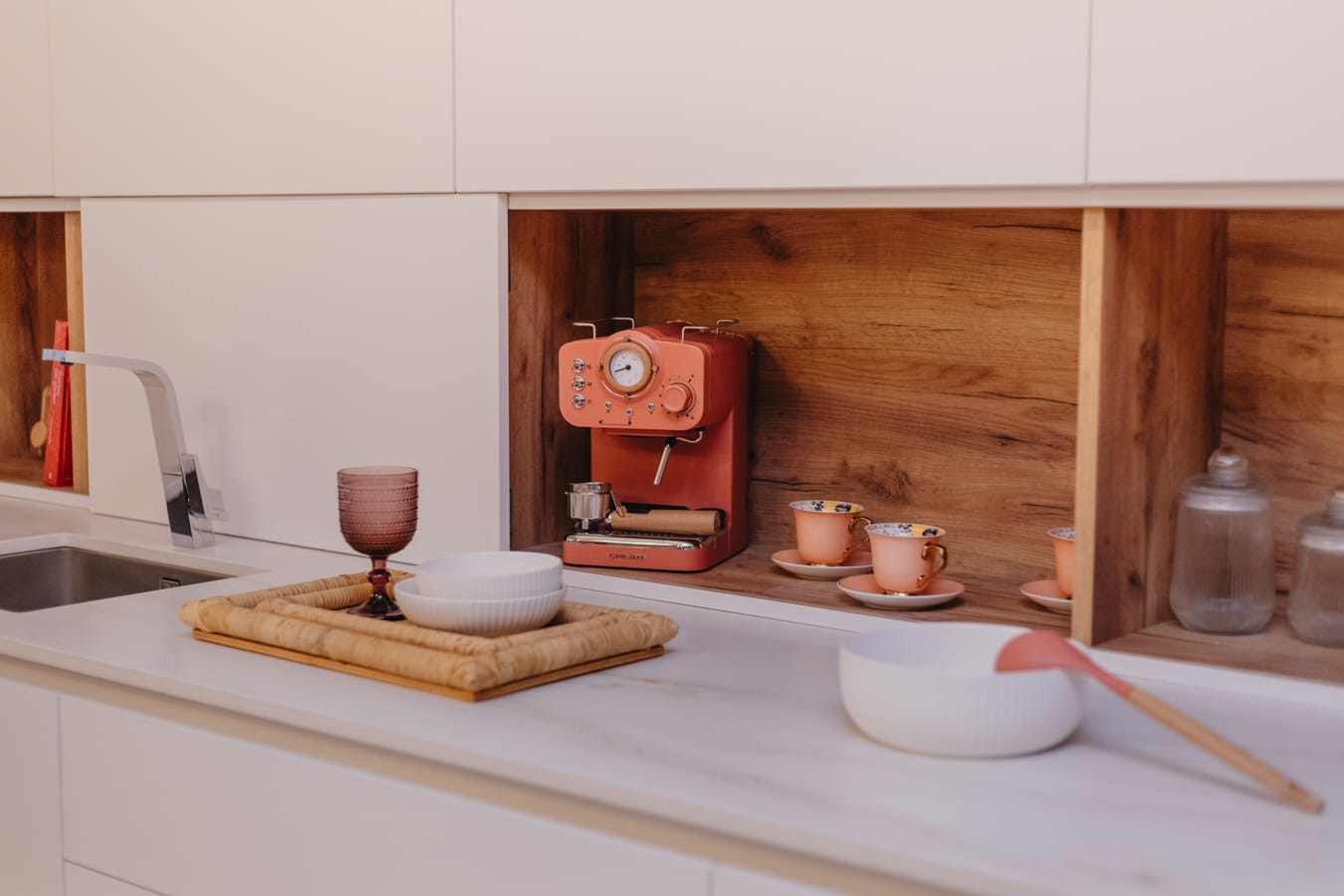 Su encimera de piedra sinterizada Oro Del Jerte combinada con puertas Blanco Alpino Mate y Roble Gold hacen de esta cocina minimalista, la cual afeminamos con toques de estilo kitsch gracias a su batería de cocina , cafetera y utensilios coral , platos, boles de flores y orquídeas.