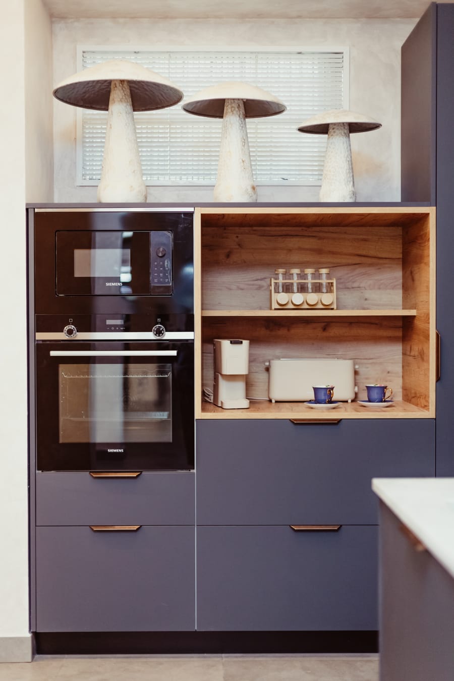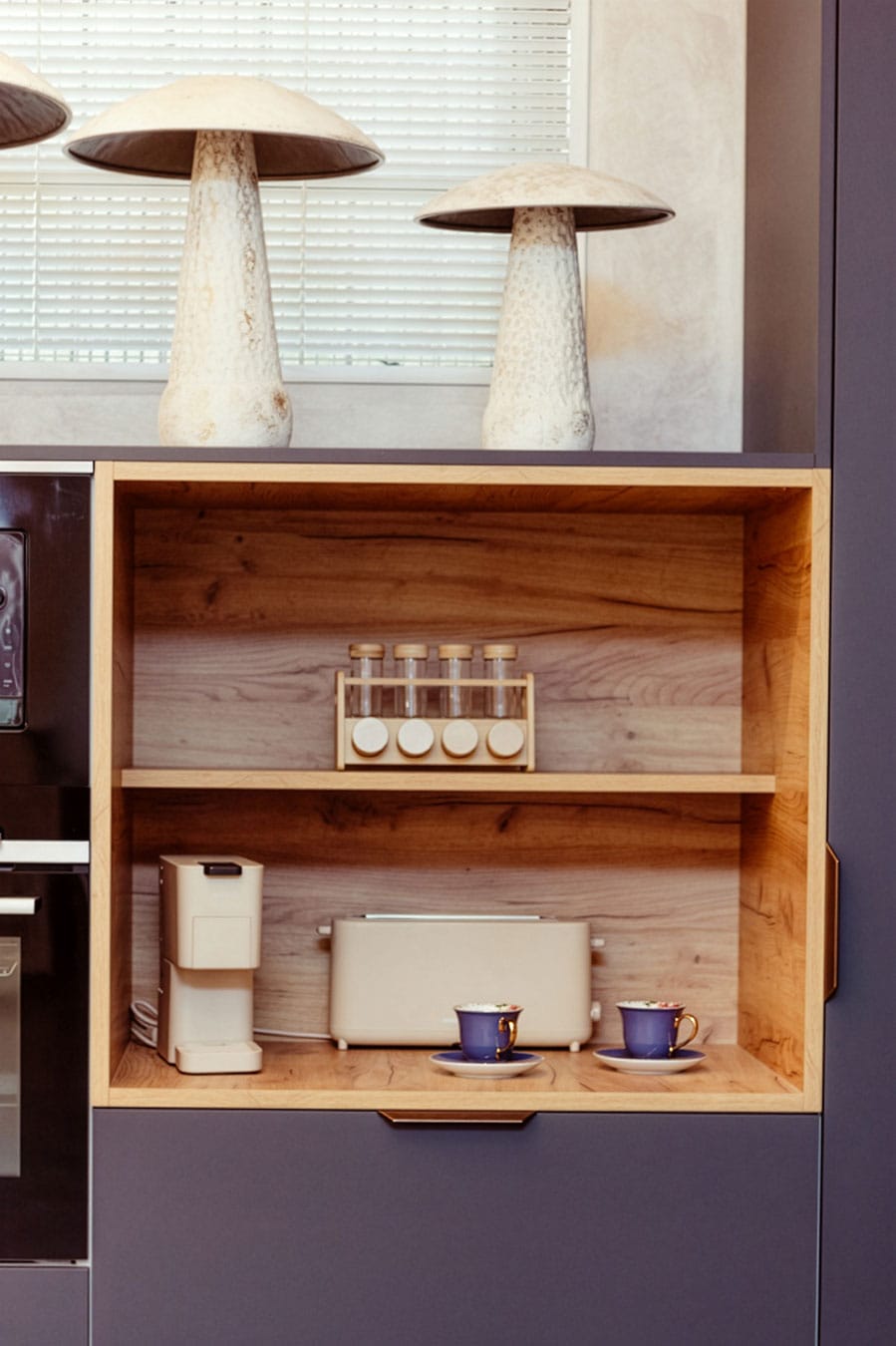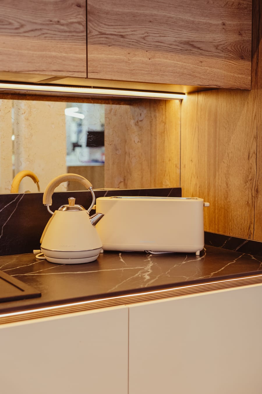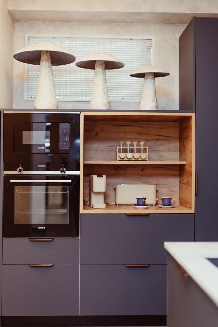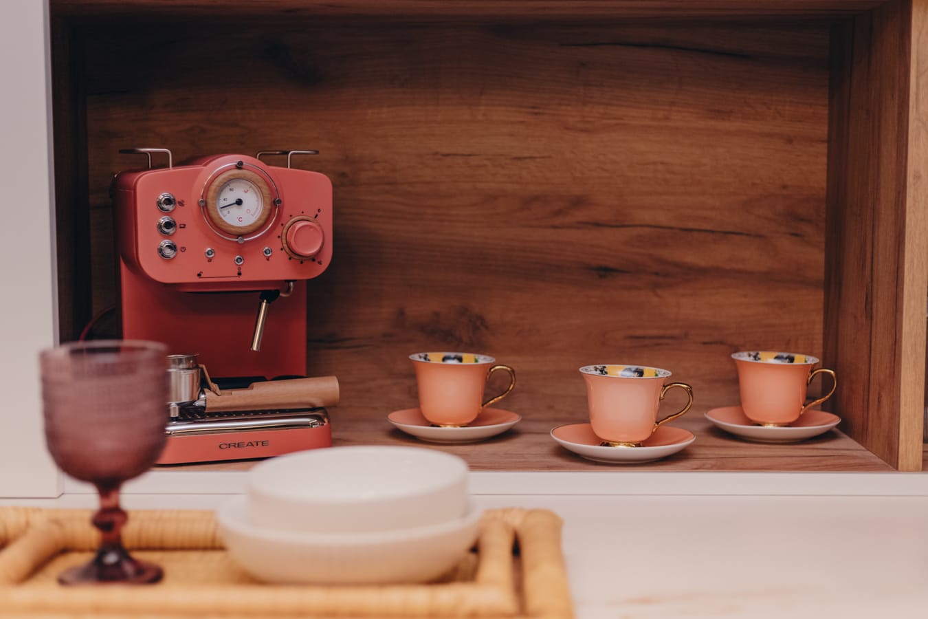 Su encimera de piedra sinterizada Oro Del Jerte combinada con puertas Blanco Alpino Mate y Roble Gold hacen de esta cocina minimalista, la cual afeminamos con toques de estilo kitsch gracias a su batería de cocina , cafetera y utensilios coral , platos, boles de flores y orquídeas.