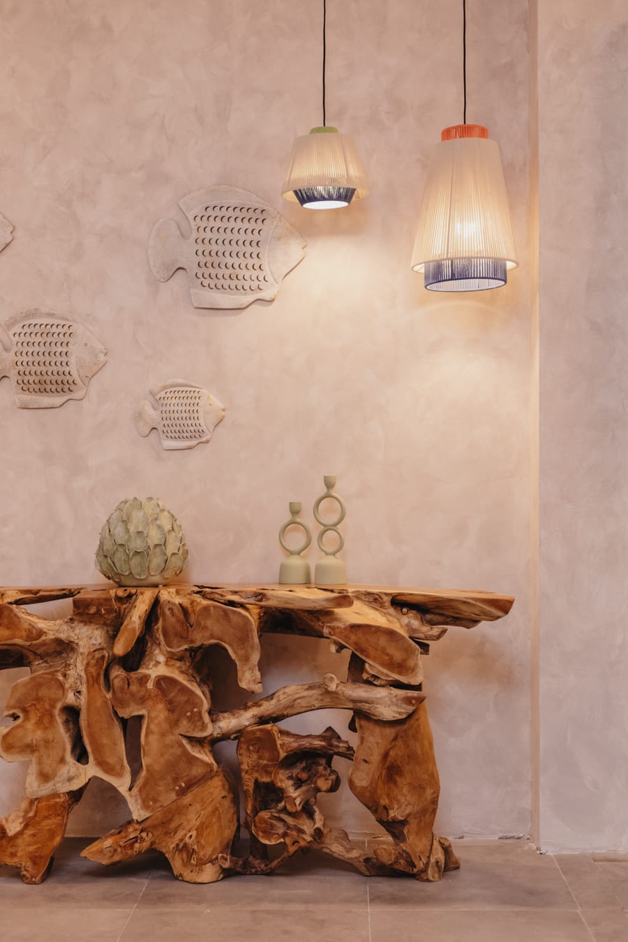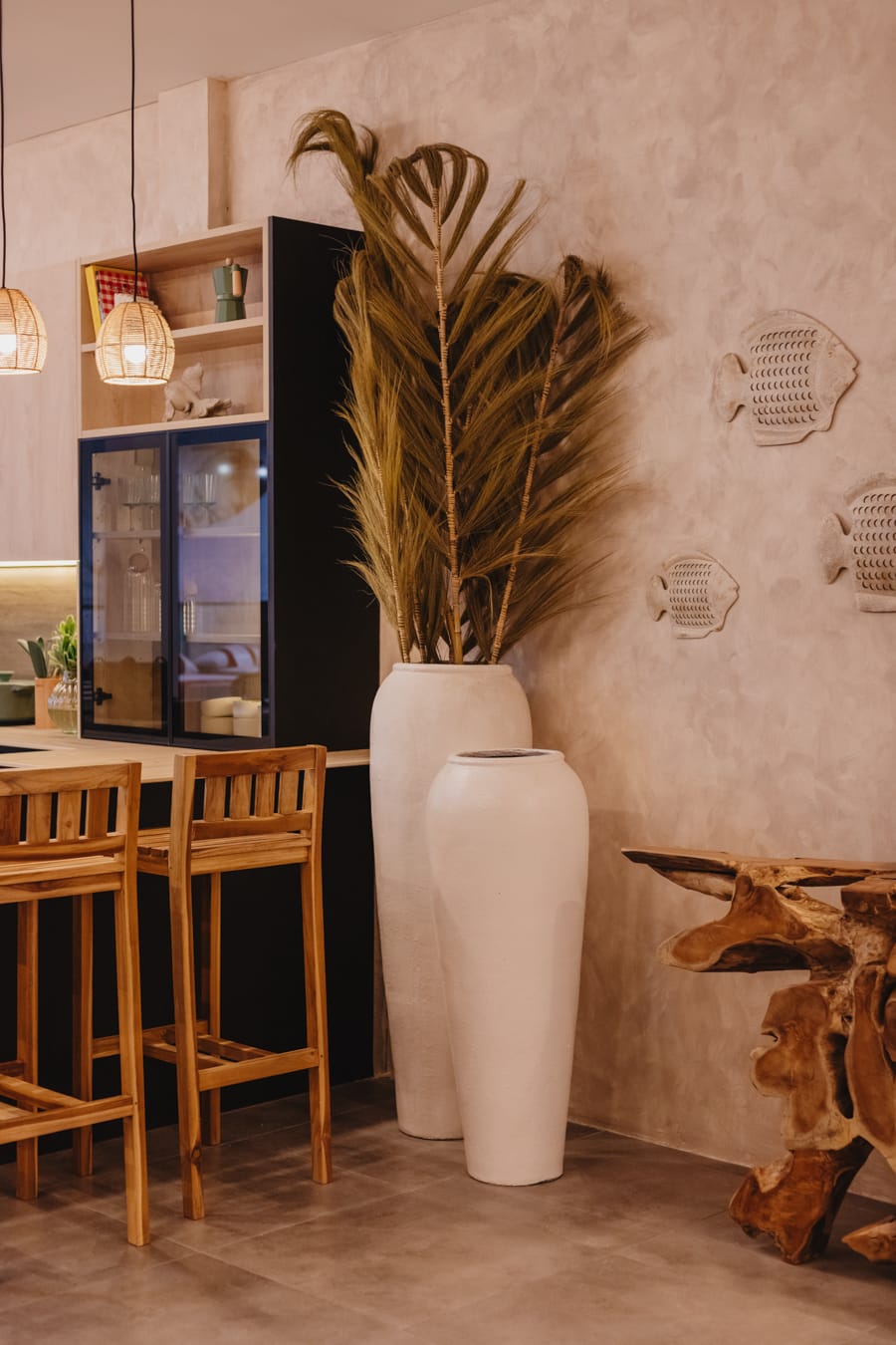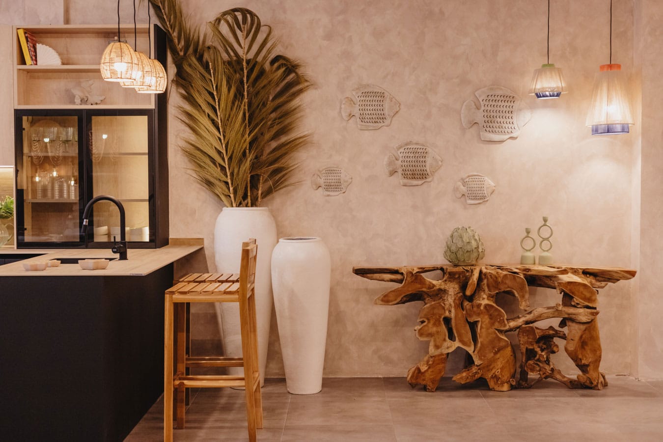 «Su decoración se basa en materiales naturales como sus imponentes lámparas para la isla, sus colgantes de cuerda, su jarra de barro o sus figuras de cerámica.»