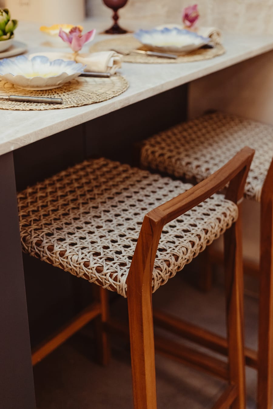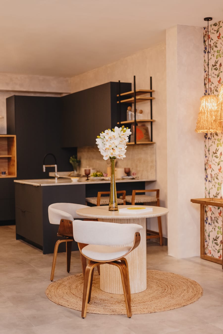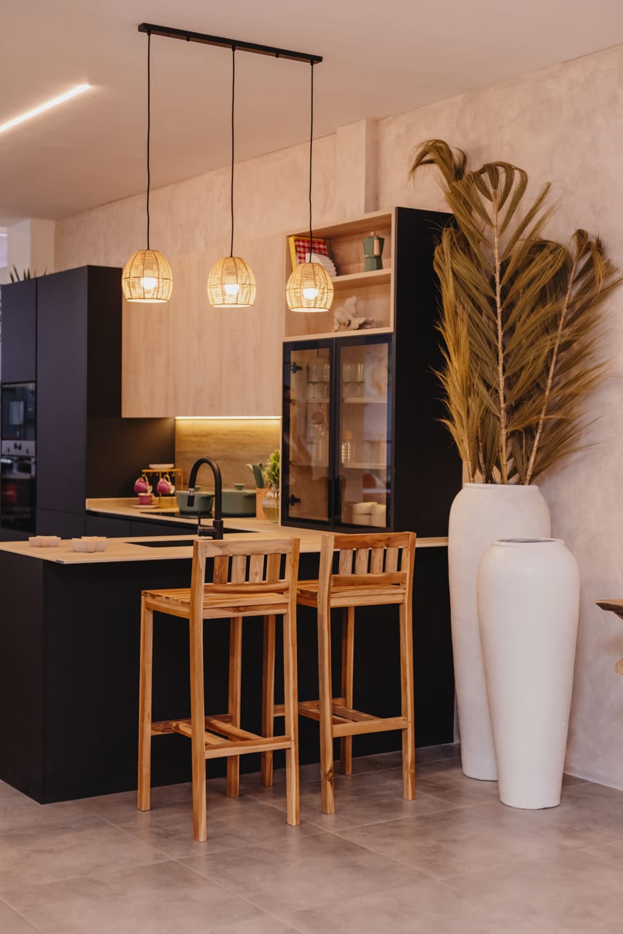 «Su decoración se basa en materiales naturales como sus imponentes lámparas para la isla, sus colgantes de cuerda, su jarra de barro o sus figuras de cerámica.»
