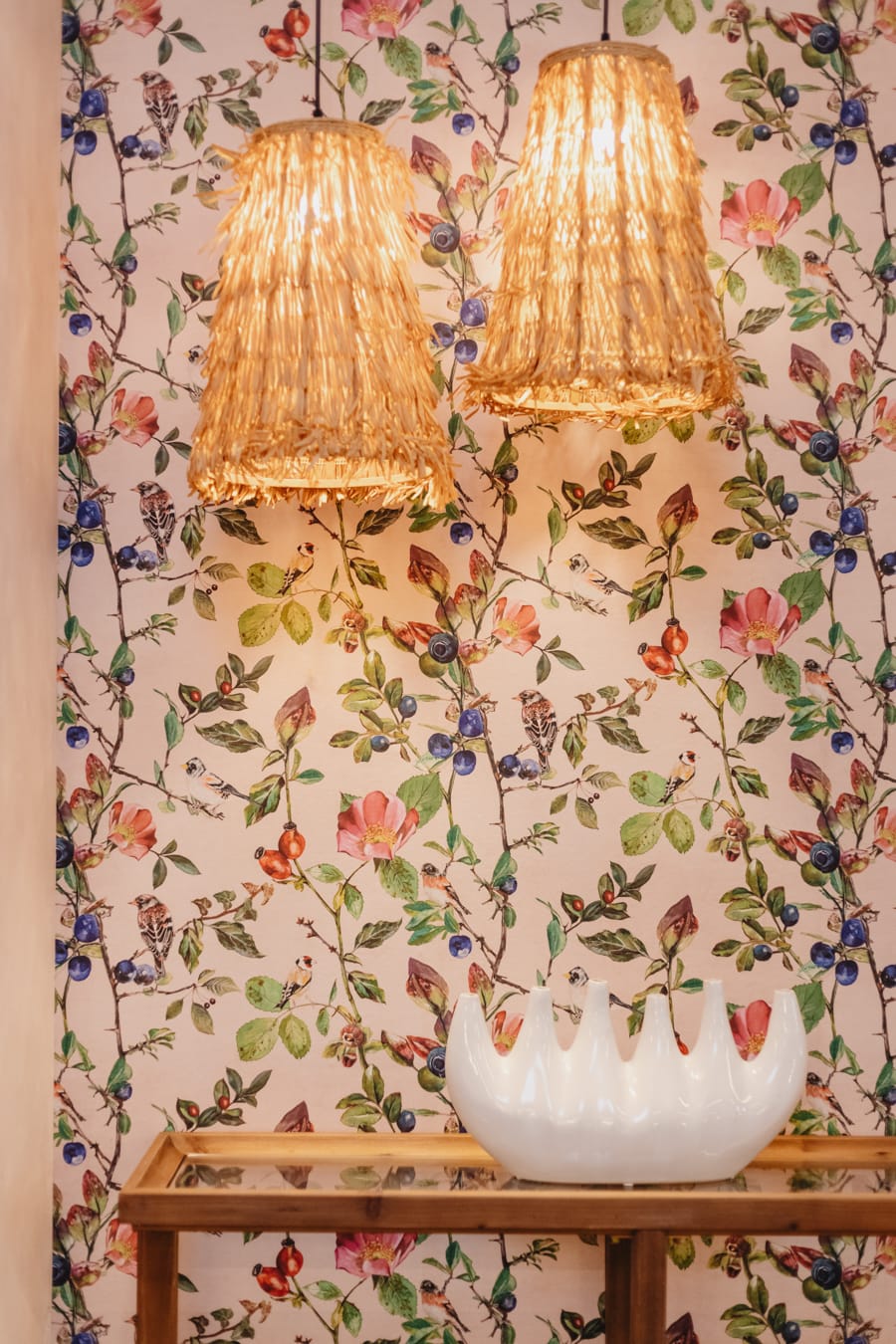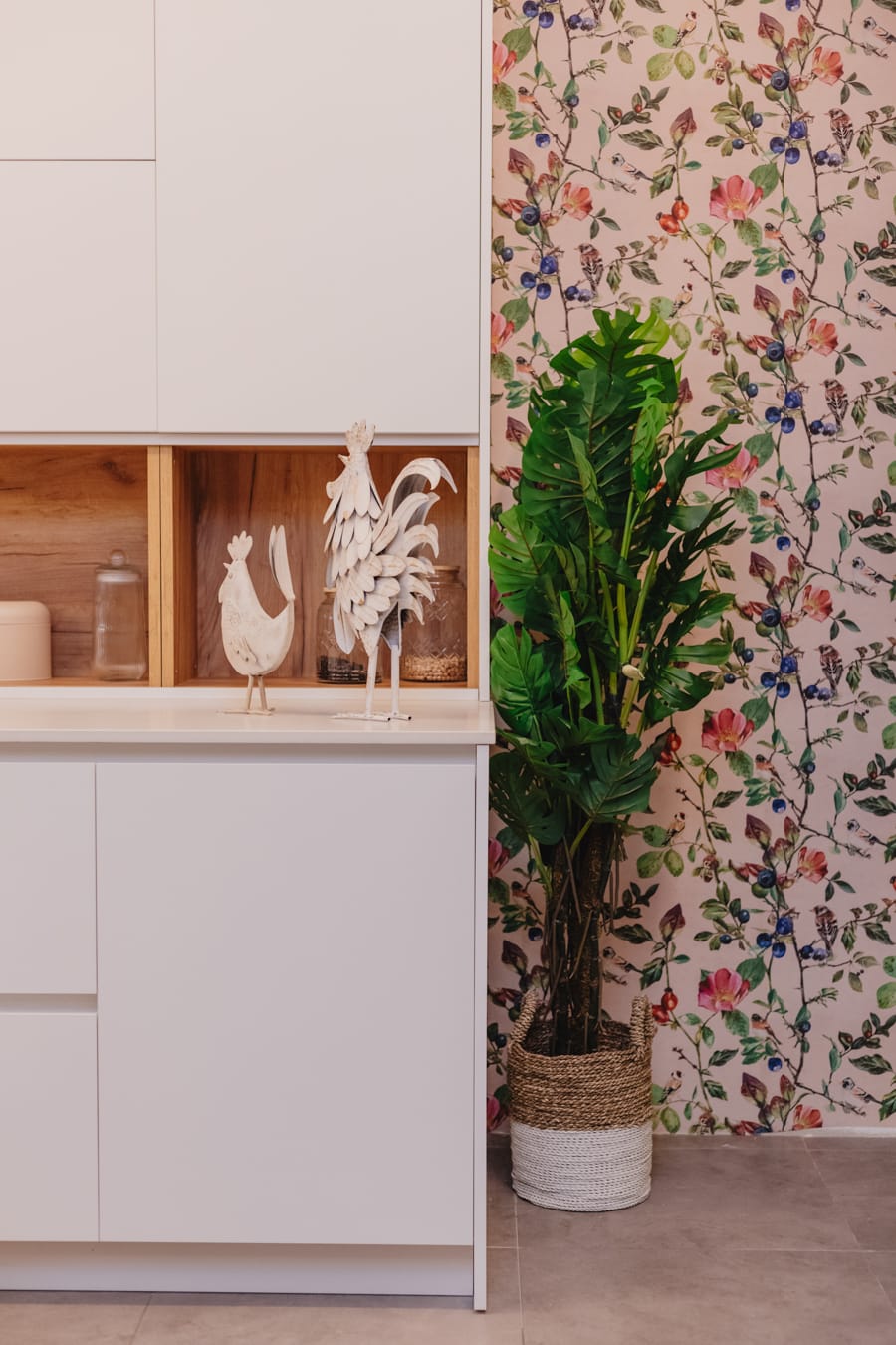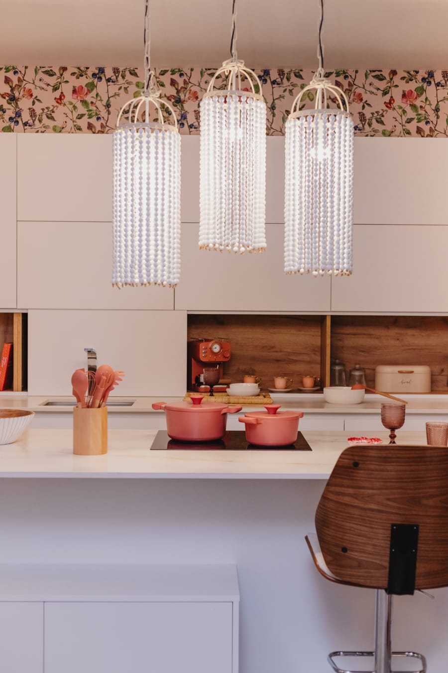 La Cocina Donna sugiere feminidad y delicadeza con su papel pintado Goldfinch song y su decoración en coral