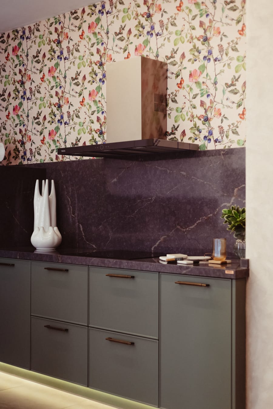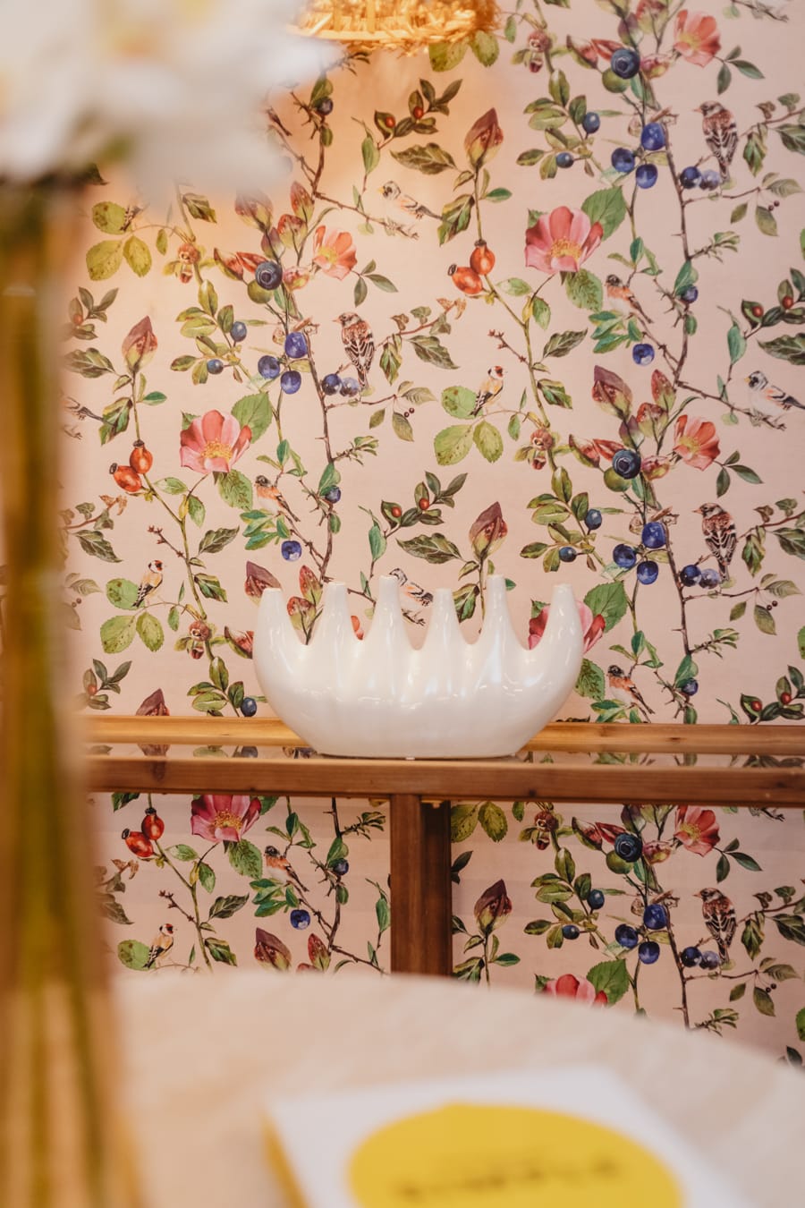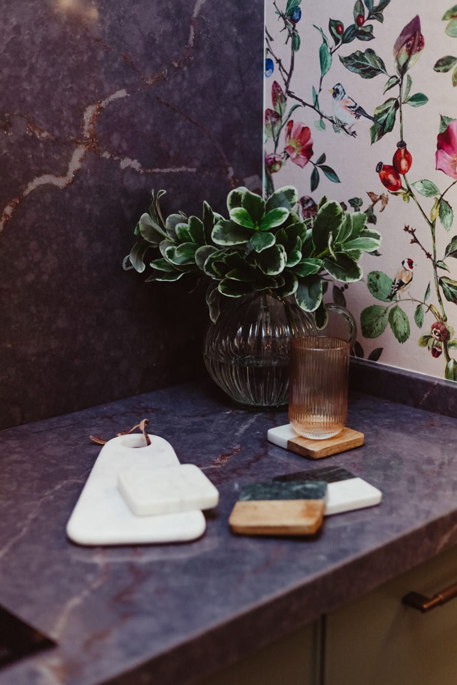 La Cocina Donna sugiere feminidad y delicadeza con su papel pintado Goldfinch song y su decoración en coral