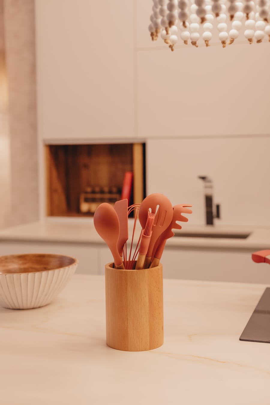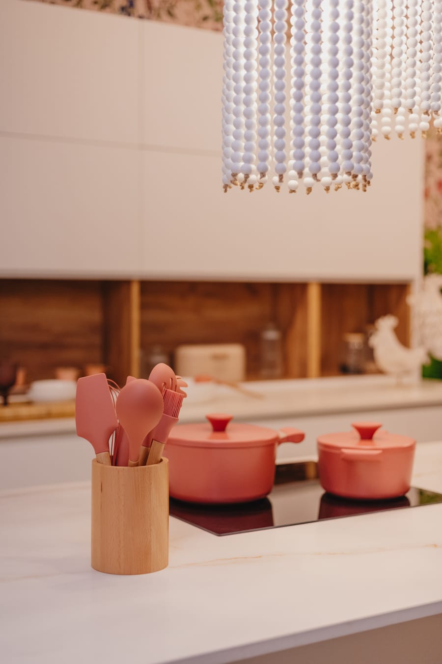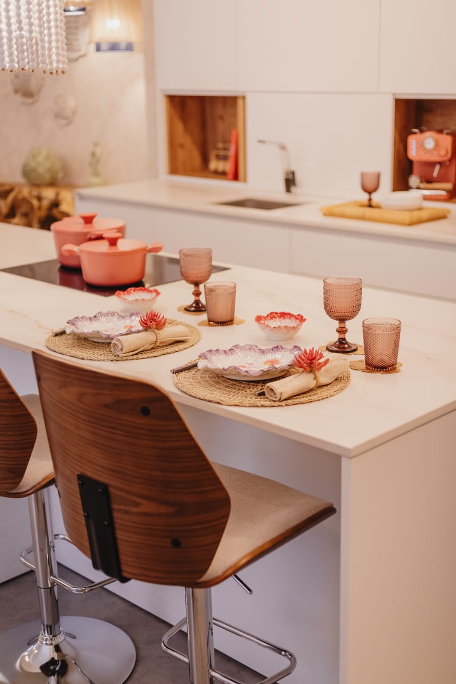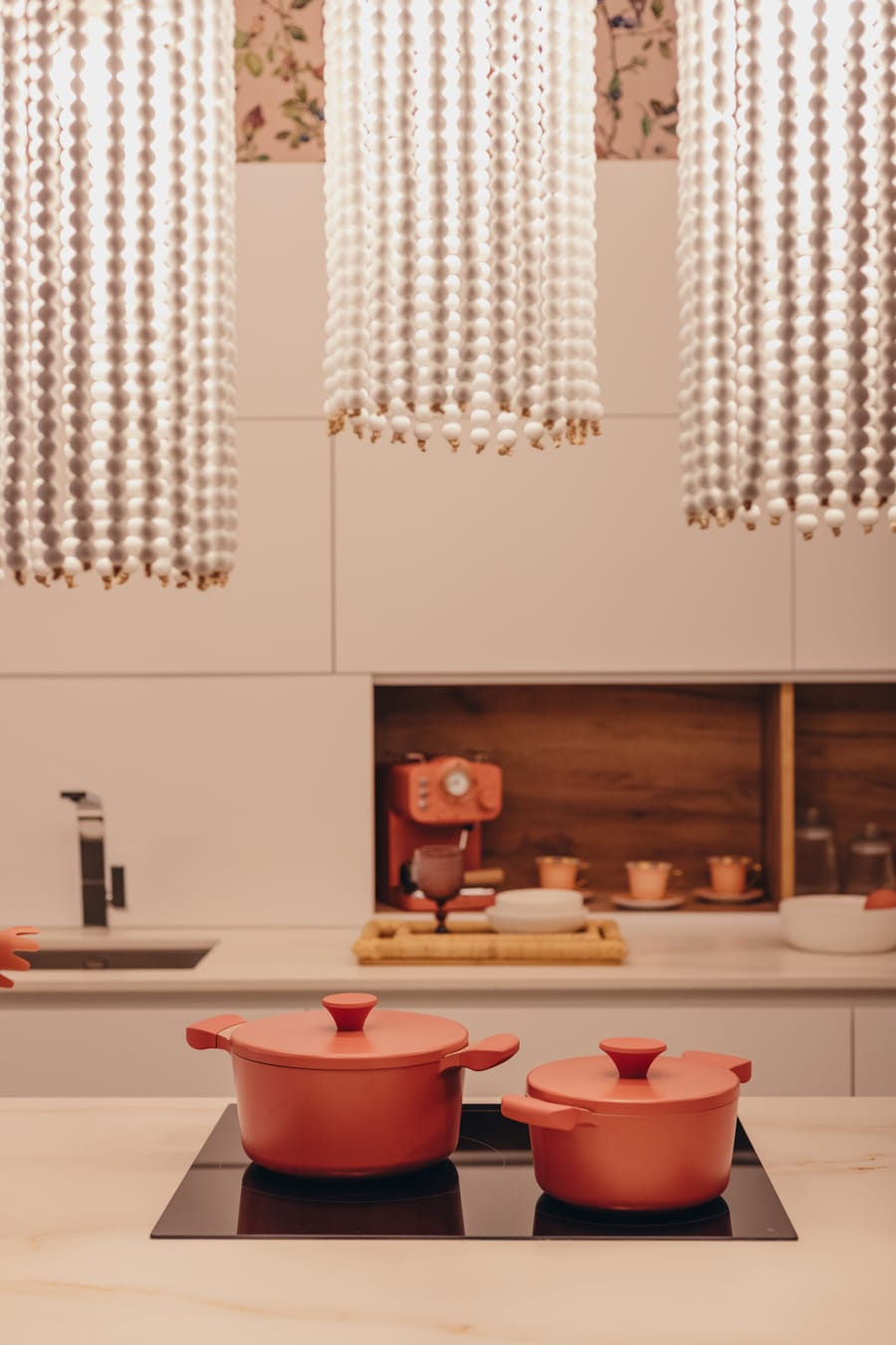 «Lámparas de cuentas blancas sobre isla con taburetes en poliéster del mismo tono y nogal.