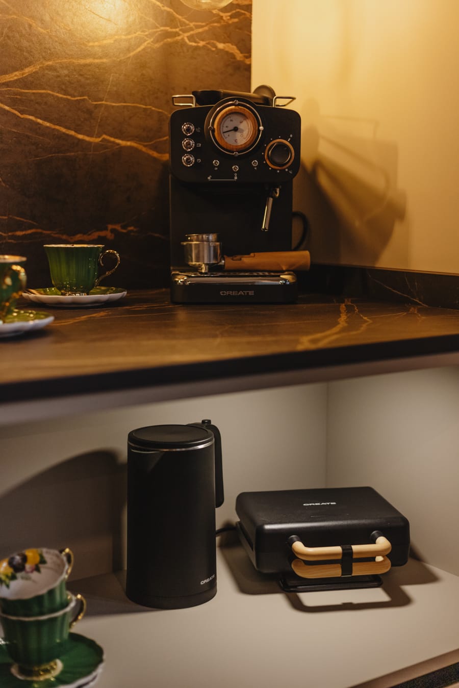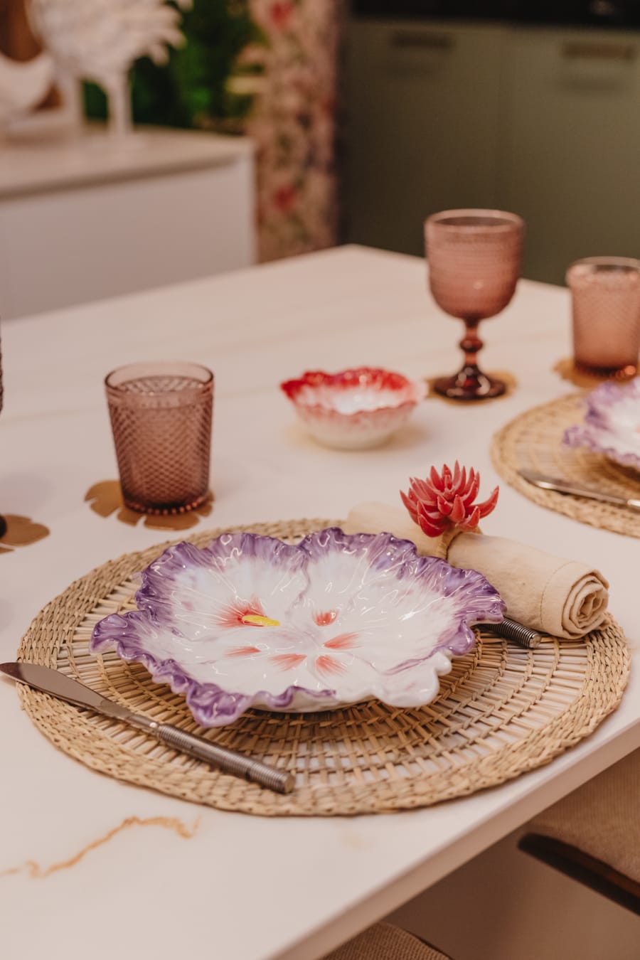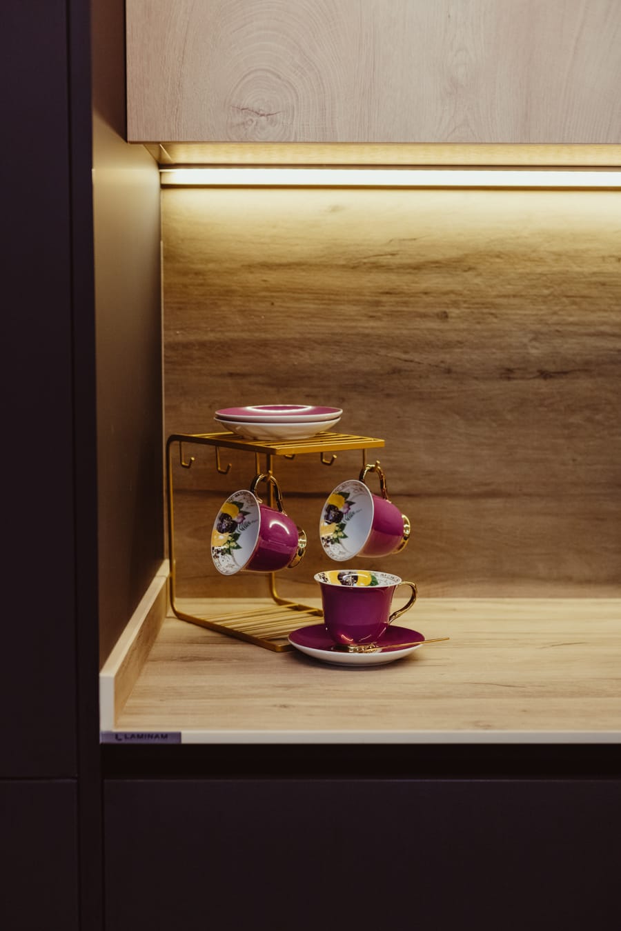 «Cubertería dorada ,grifería negra, y juego de café en tono buganvilla para dulcificar Elegance.»