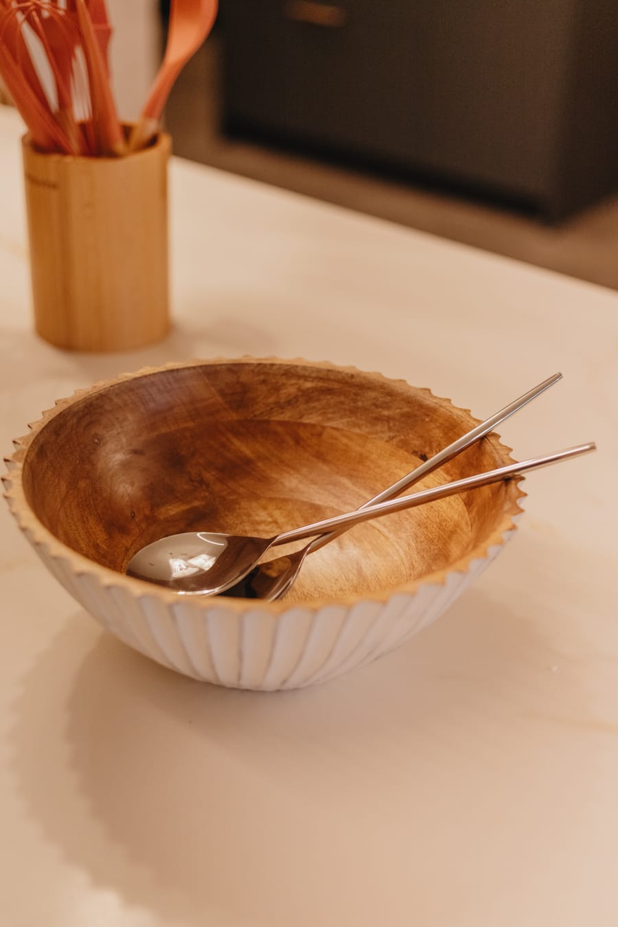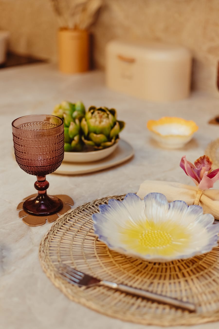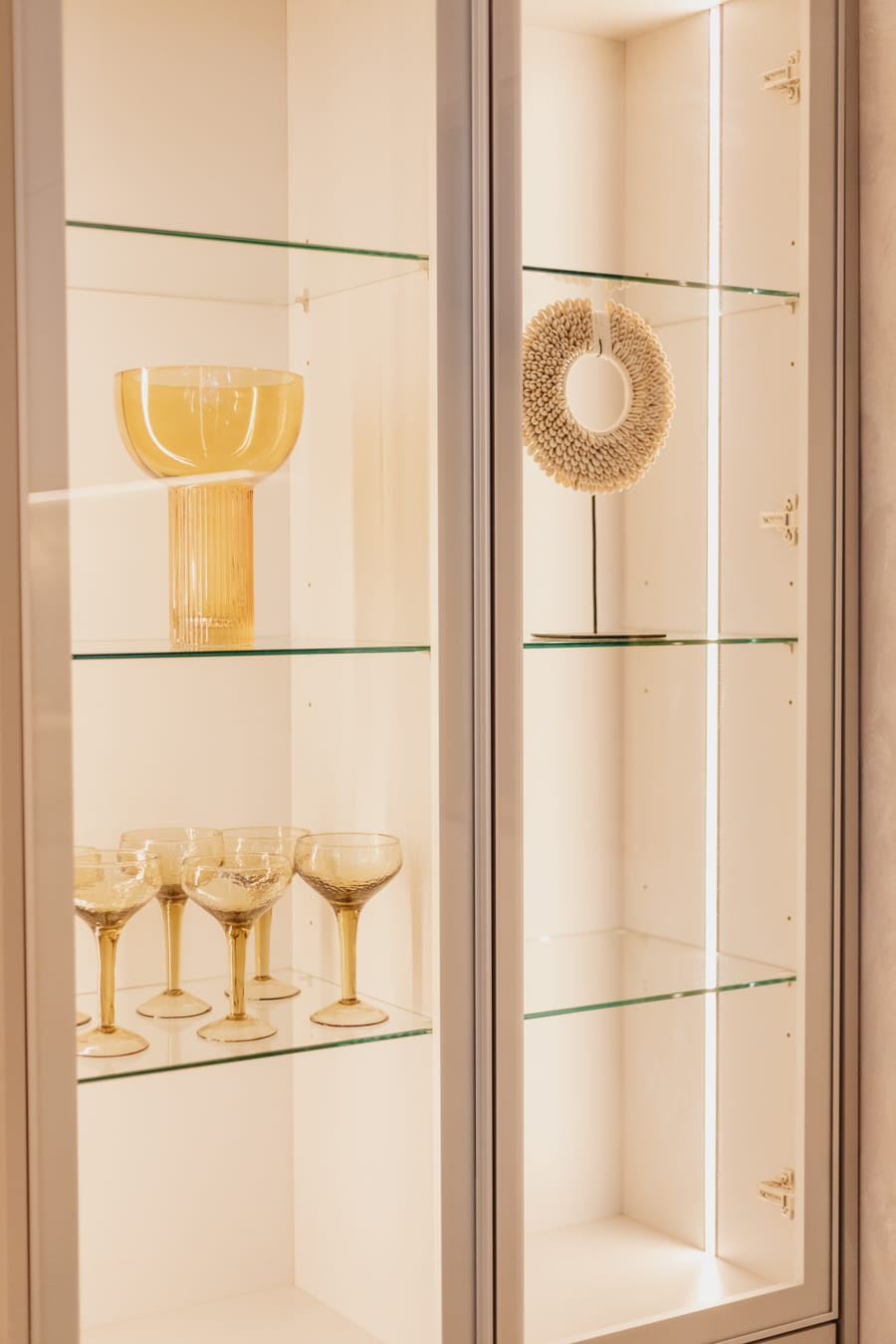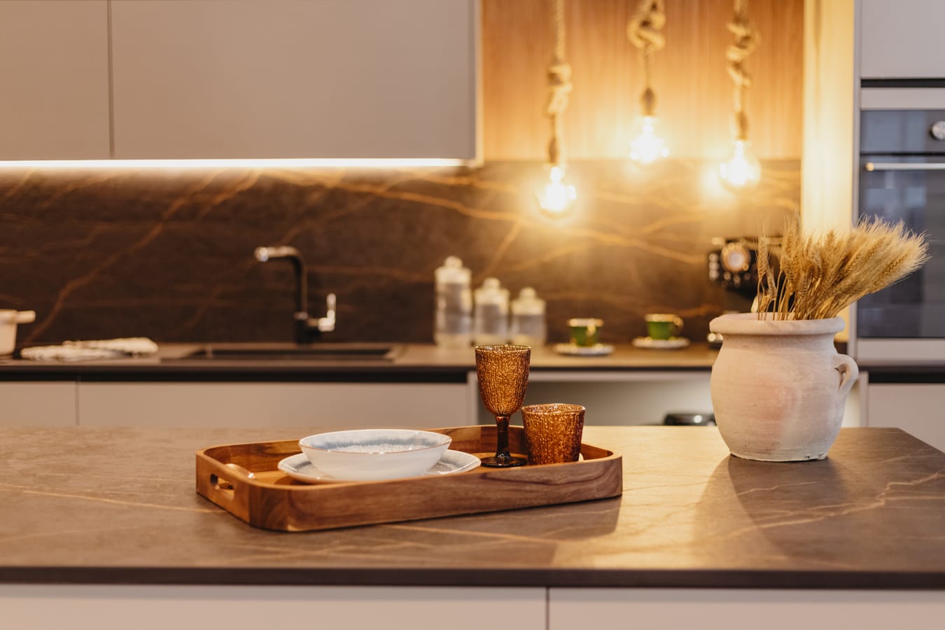 «Su cristalería ámbar y vajilla de porcelana sugieren lo rústico en combinación con la encimera.»