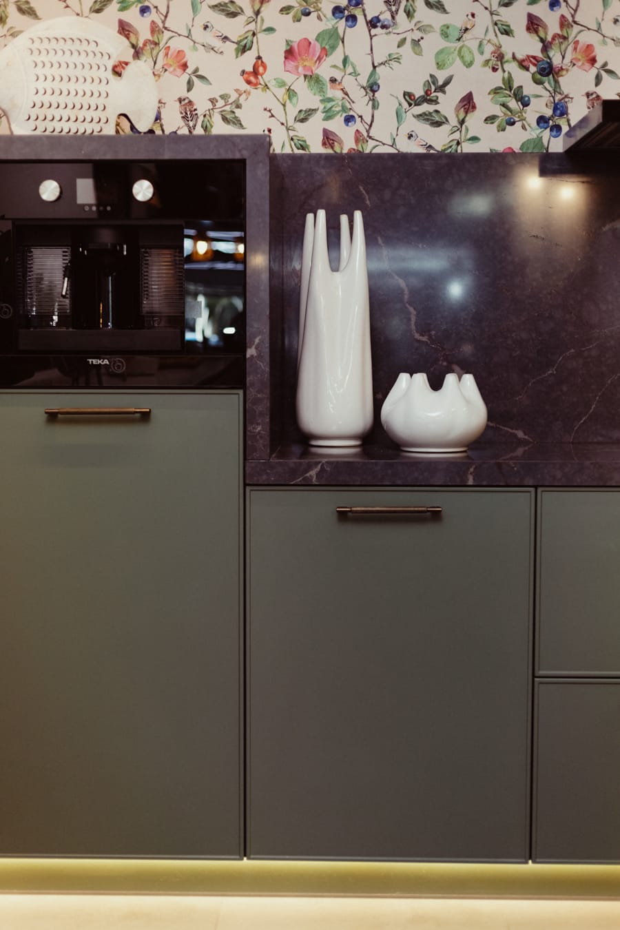 El papel pintado Goldfinch song , jarrones , tabla , posavasos y peces en blanco resaltan en esta cocina de electrodomésticos negros que dan más personalidad si cabe a su diseño.