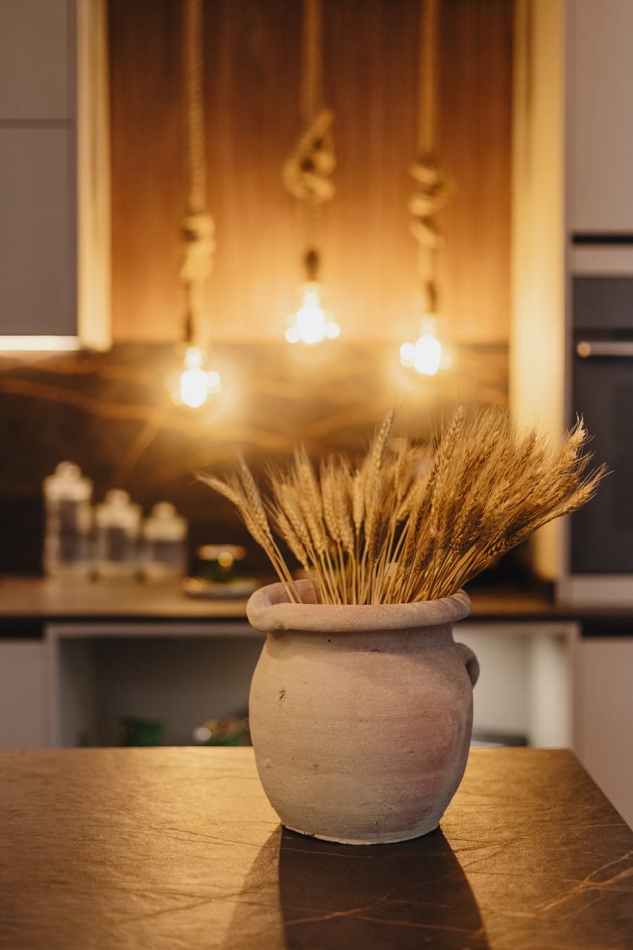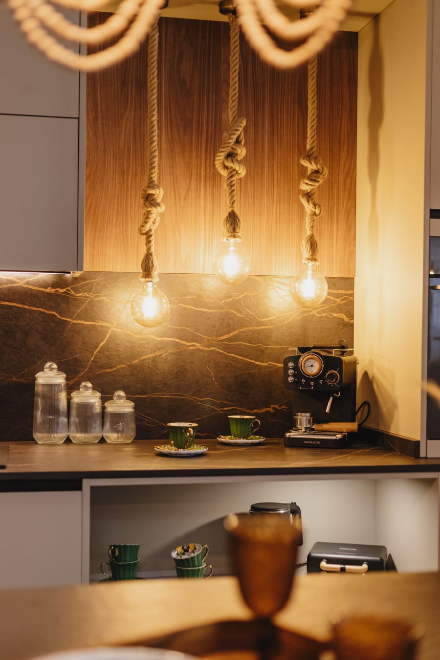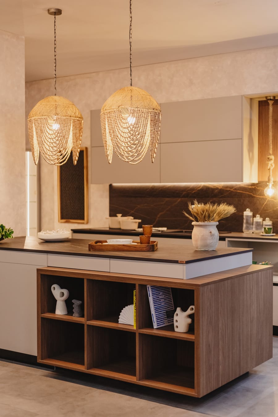 Espacio entre cocinas con pintura beige Toscana , jarrones XXL con lámparas colgantes en idénticos tonos del papel pintado, el cual envuelve las siguientes dos cocinas, y exclusiva consola raíz de teca coronada con jarrón alcachofa.