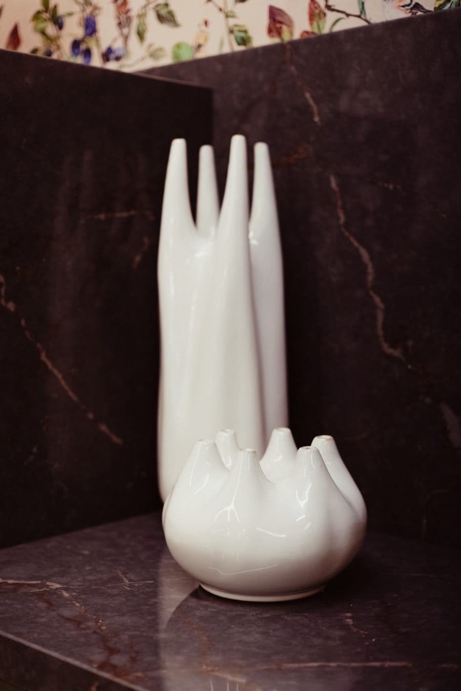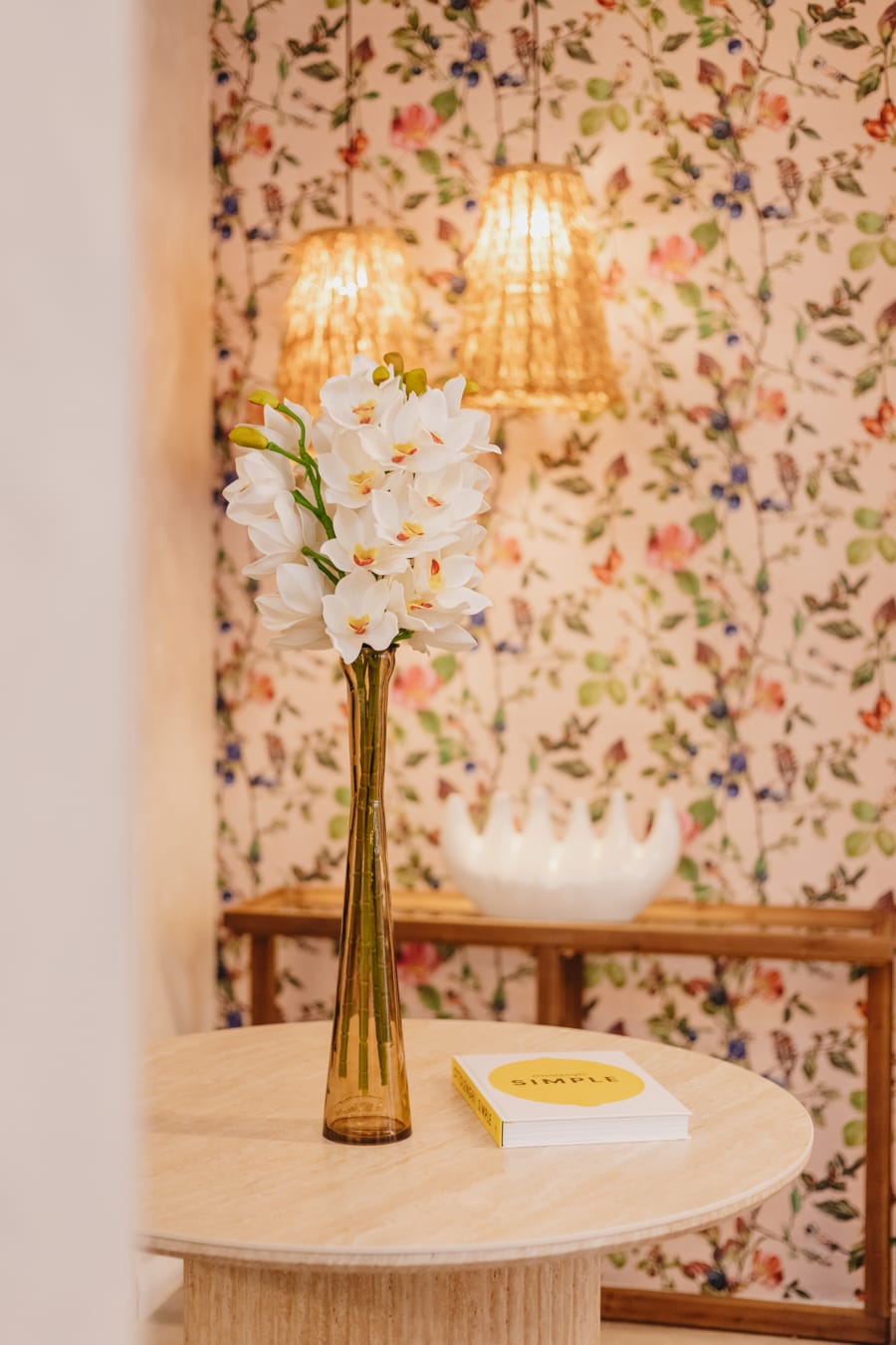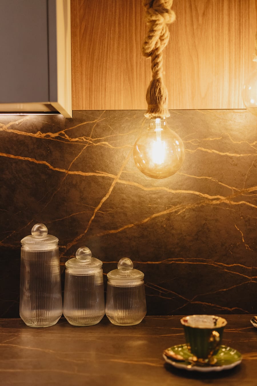 Espacio entre cocinas con pintura beige Toscana , jarrones XXL con lámparas colgantes en idénticos tonos del papel pintado, el cual envuelve las siguientes dos cocinas, y exclusiva consola raíz de teca coronada con jarrón alcachofa.